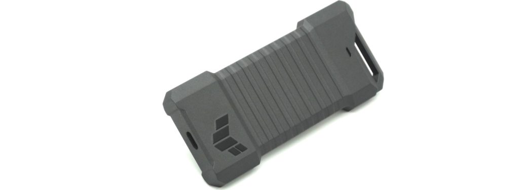 Das ASUS TUF GAMING A1 SSD-Gehäuse besteht komplett aus mattem, grau lackiertem Metall. Die Vorderseite ziert ein Logo der TUF-Reihe. Auf der Rückseite befindet sich ein Deckel, welcher mit vier Schrauben verschlossen ist. Auf dem Deckel wurde der Produktname und zwei Sticker mit technischen Daten aufgebracht. Das Gehäuse bietet auf der Unterseite einen USB-C Anschluss, dieser unterstützt das USB-Protokoll in Version 3.2 Gen 2×1 und bietet damit theoretische Geschwindigkeiten von bis zu 10 Gbit/s. Im oberen Bereich der Vorderseite befindet sich eine weiße LED und auf der Oberseite ist eine Lasche, die zur Befestigung des Gehäuses genutzt werden kann.![]()