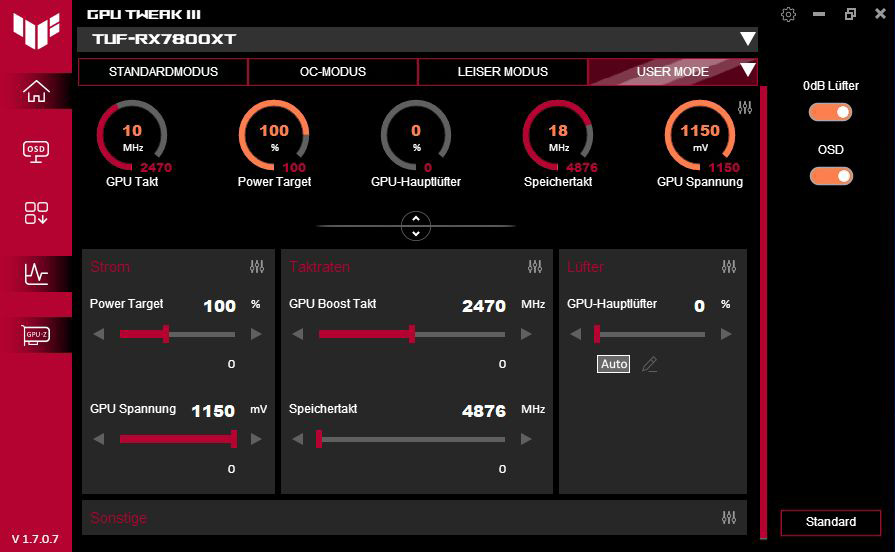 Das Allrounder Tool von ASUS bietet alles, was das Herz begehrt. Bereits auf der Hauptseite stehen dem Anwender alle relevanten Daten zur Verfügung. So lassen sich die Lüftergeschwindigkeiten manuell oder das OSD-Display anpassen. Selbst an ASUS GPU-Z wurde gedacht, um alle relevanten Informationen der verbauten Grafikkarte On Top anzeigen zulassen. Dieses Tool bietet somit eine Vielzahl von Einstellungsmöglichkeiten.