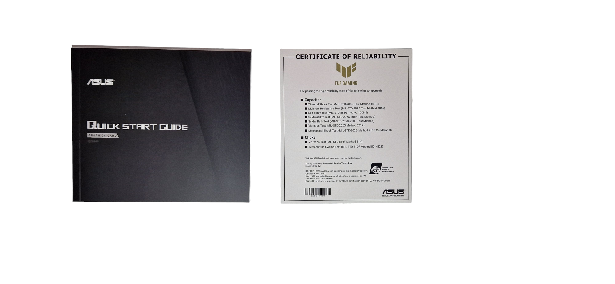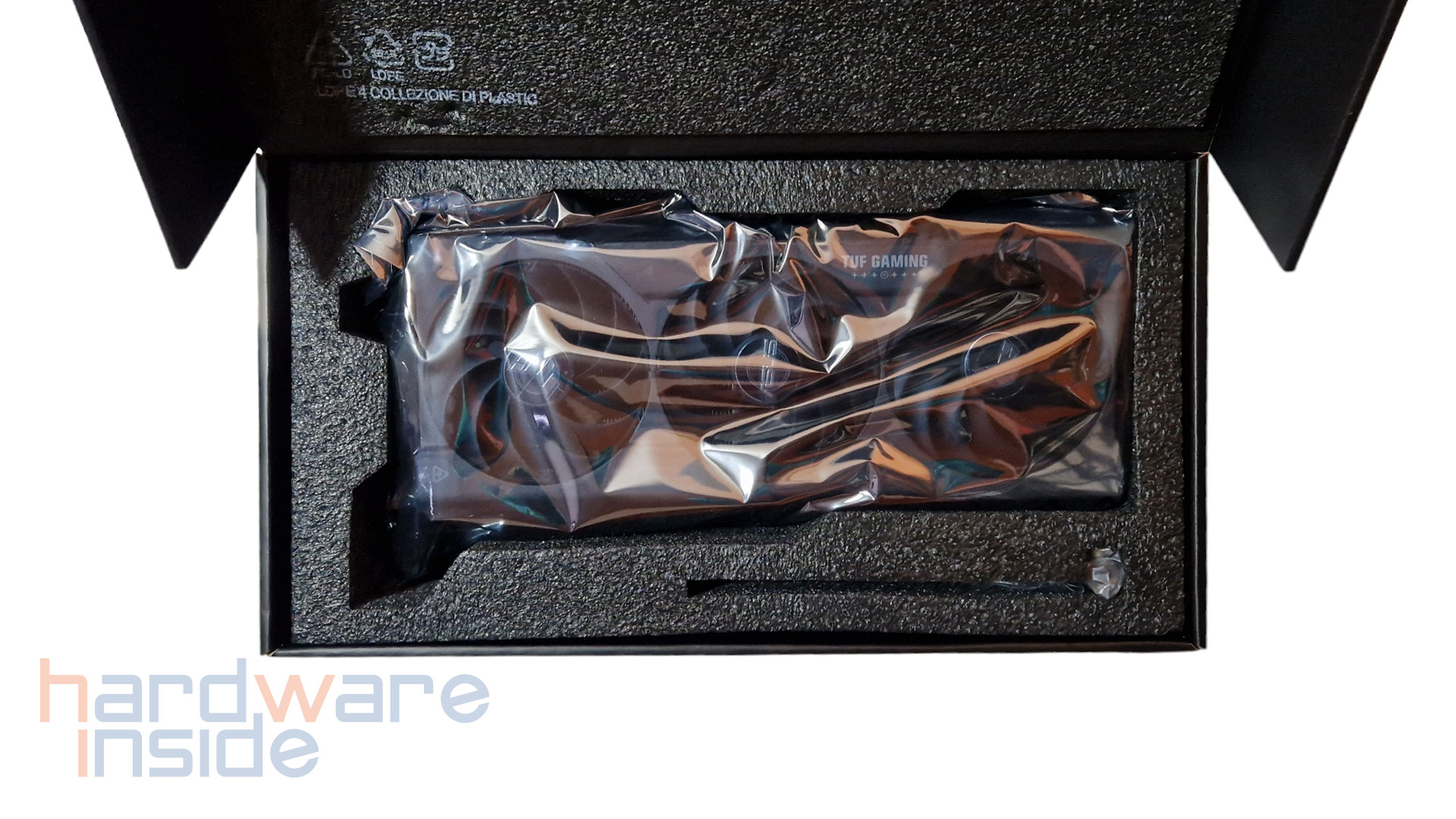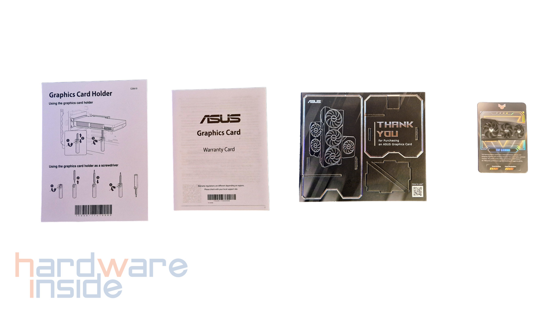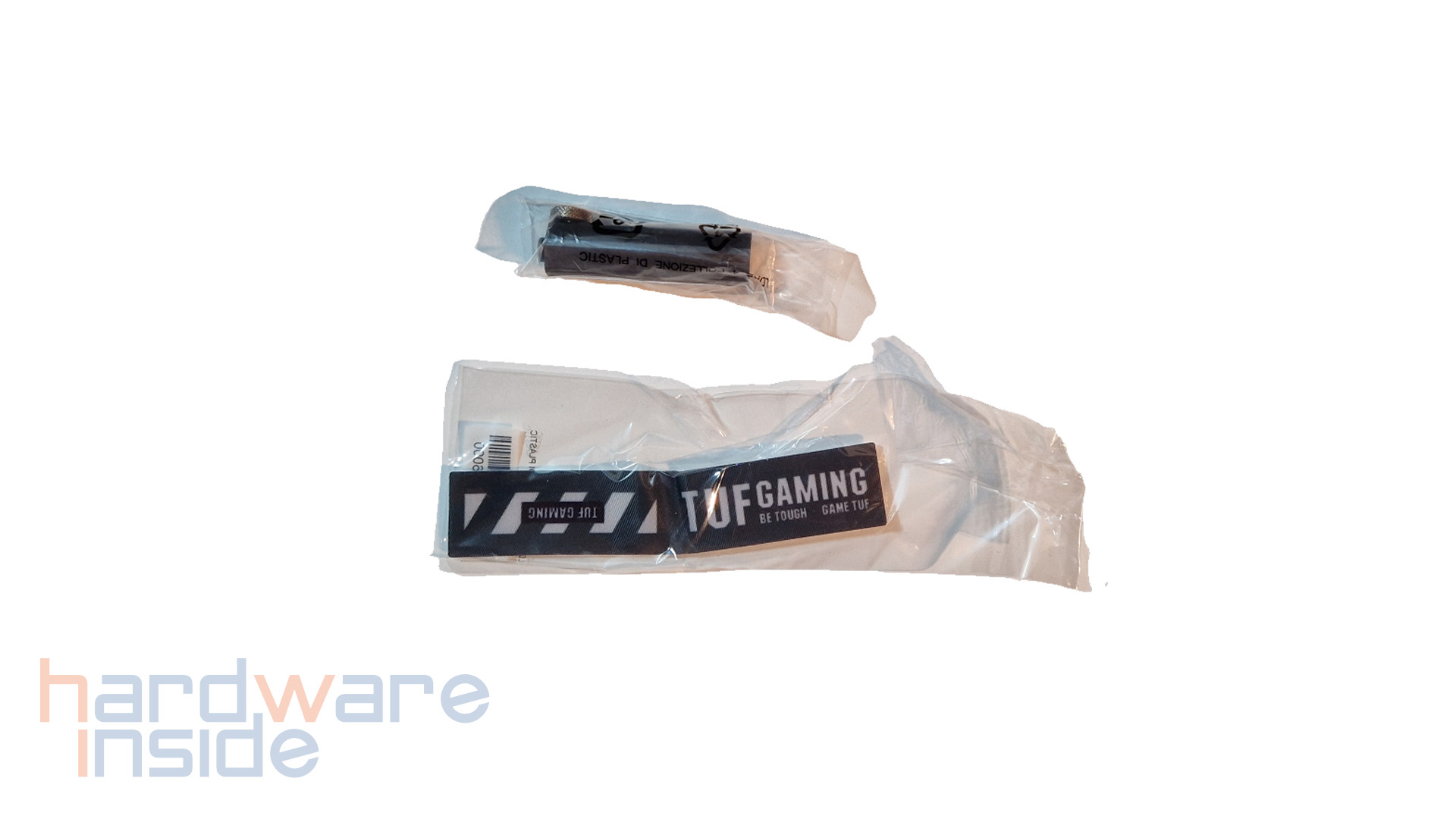 Der Lieferumfang fällt sehr üppig aus. Neben der TUF 7800XT 016G Gaming OC die sicher in Antistatik-Folie verpackt ist, befindet sich neben einem Klett-Kabelbinder und einem Grafikkartenhalter noch eine kleine Kartonage, die unter der Grafikkarte verstaut ist, mit folgendem Inhalt: