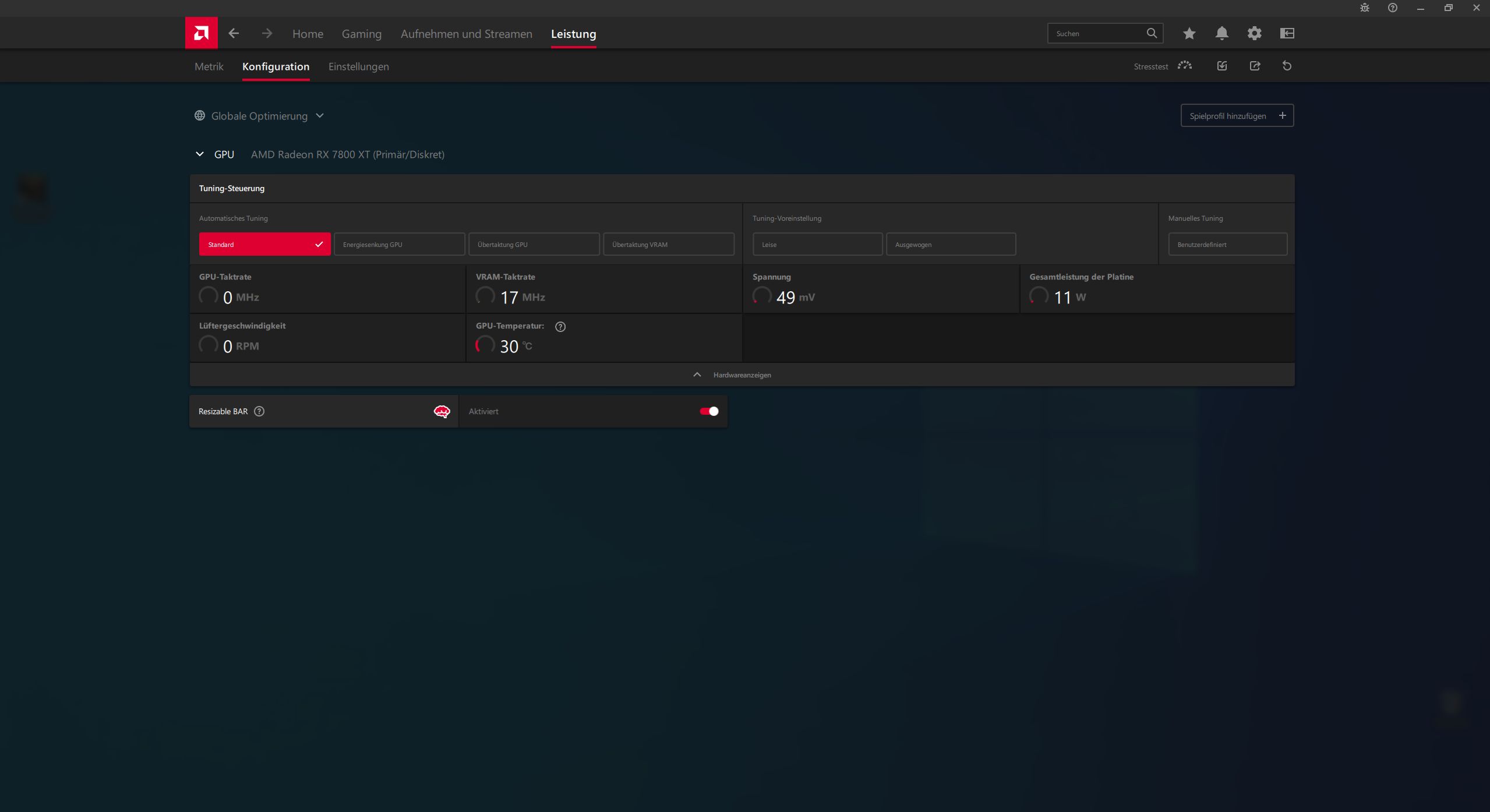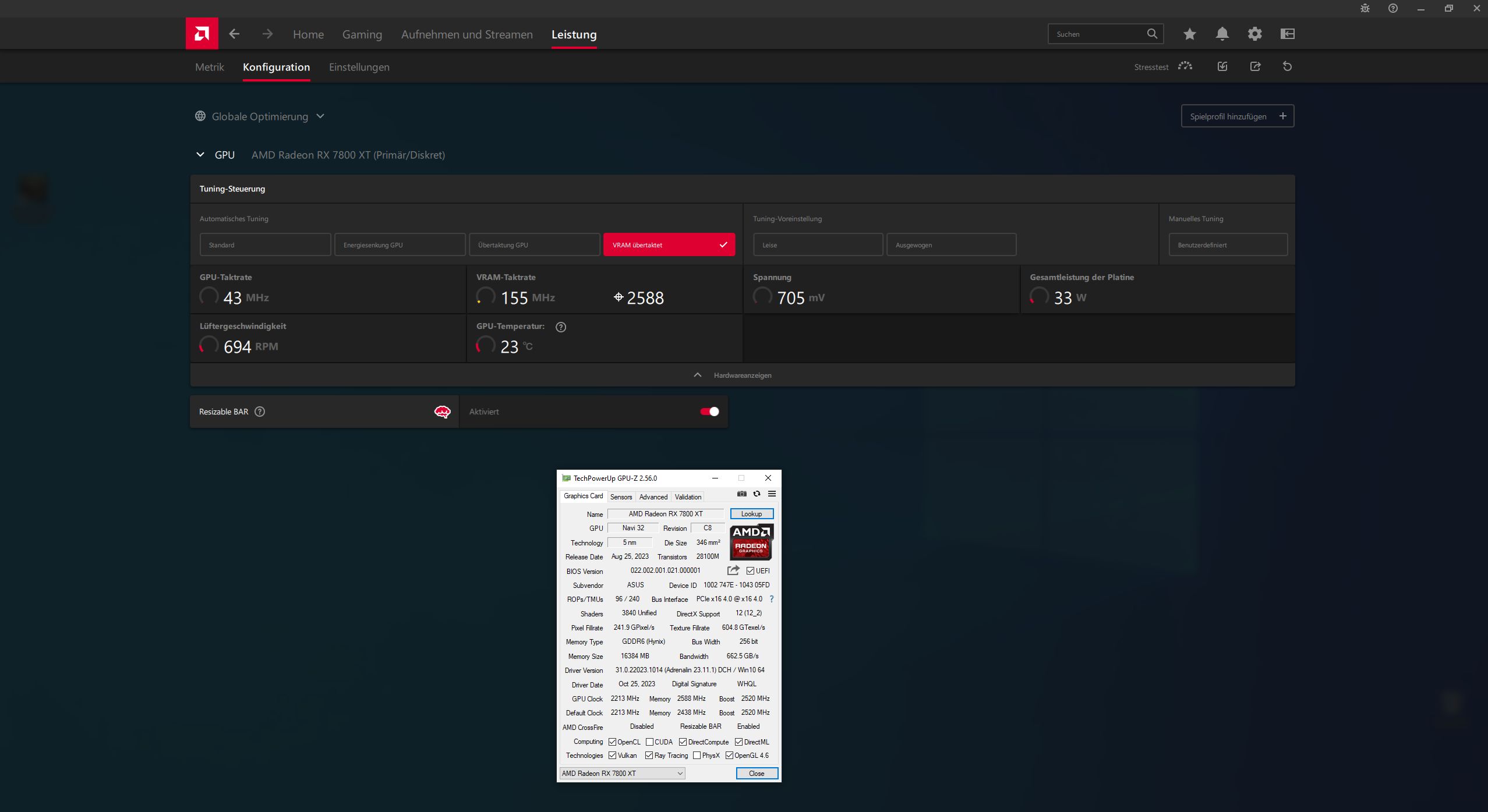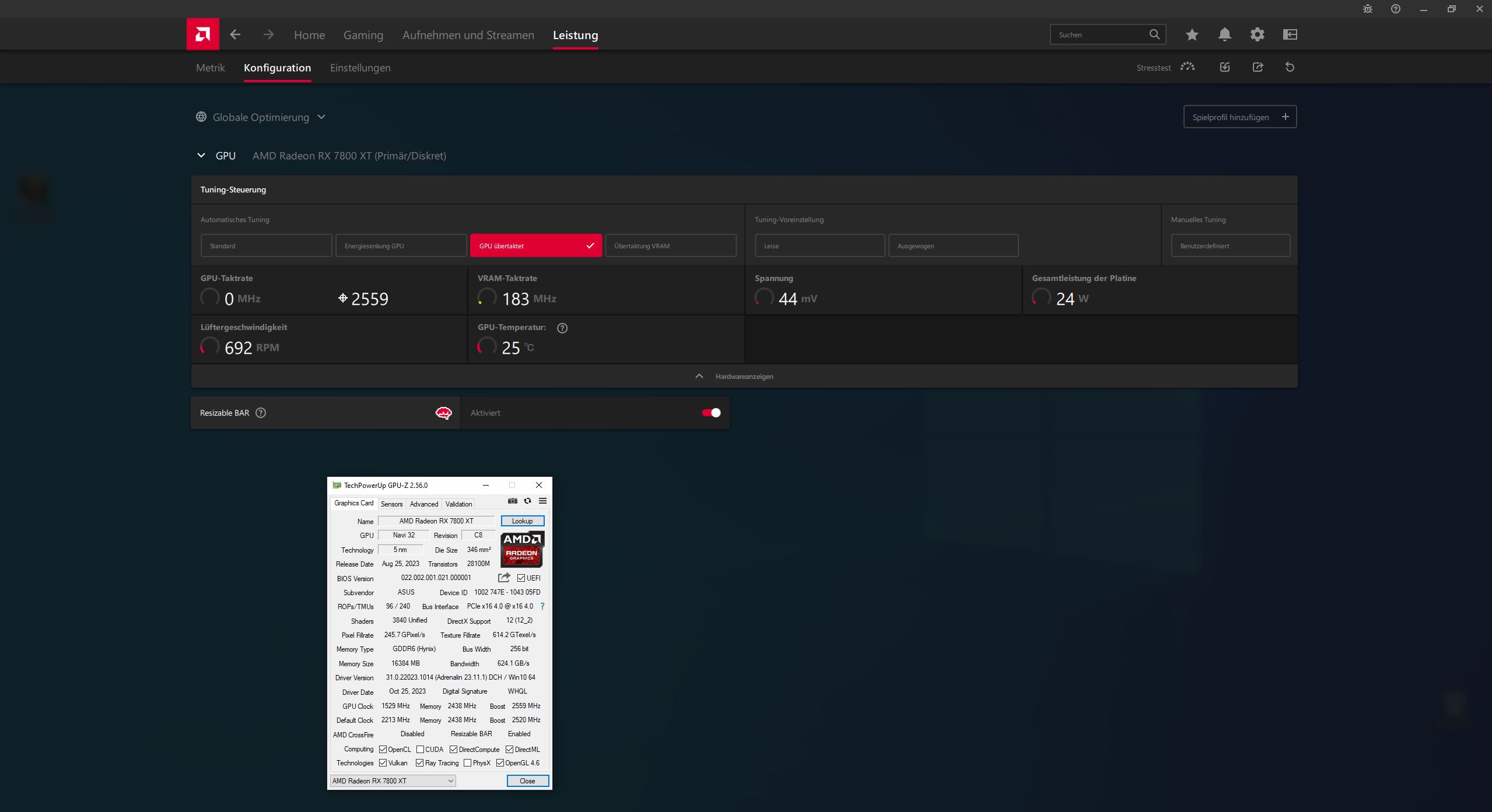 Um auch das letzte aus der ASUS TUF Gaming Radeon RX 7800 XT OC rauszuholen, wurde per Treiber das Powertarget auf 115 % (+15 %) erhöht und die Standardspannung auf 1150 mV belassen (Ausgangsspannung der Grafikkarte). Mit 2854 MHz auf der GPU und 2595 MHz auf dem Speicher war das der maximal Wert den wir erreichen konnten. So lagen wir mit ca. 330 MHz über dem vom Hersteller angegebenen Wert von 2520 MHz im Boost und ca. 100 MHz (je nach Anwendung) über dem Standardspeichertakt.