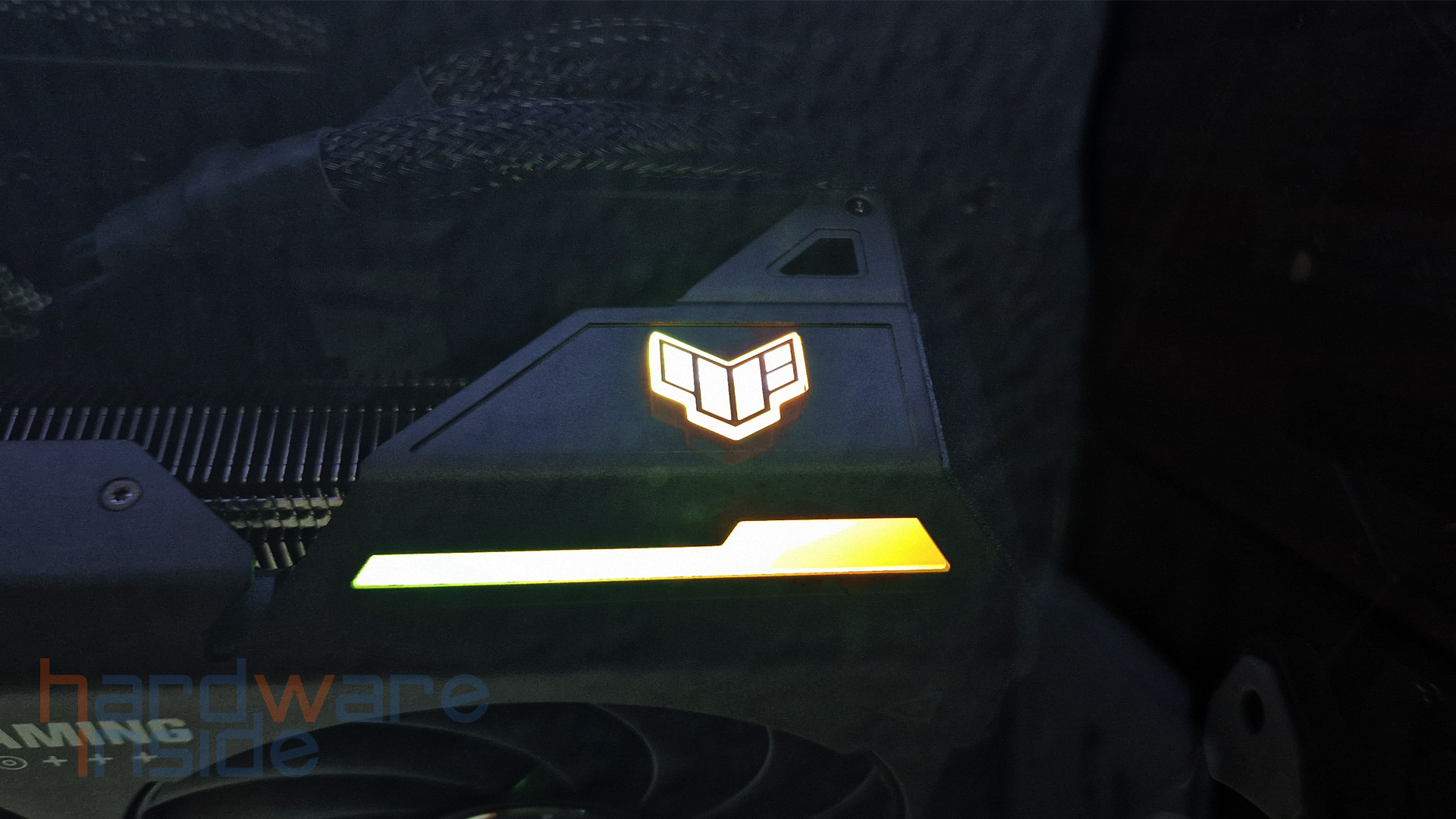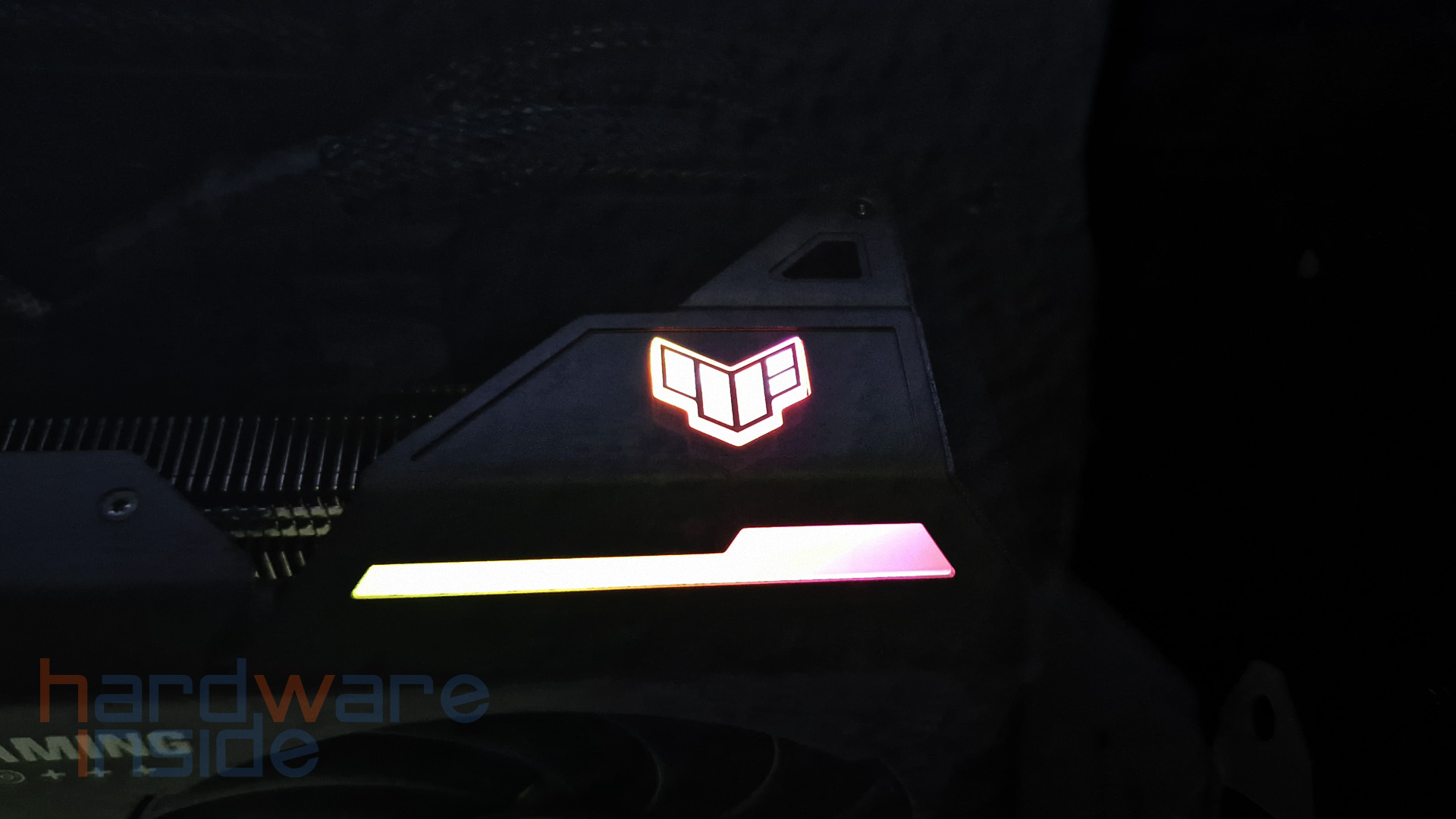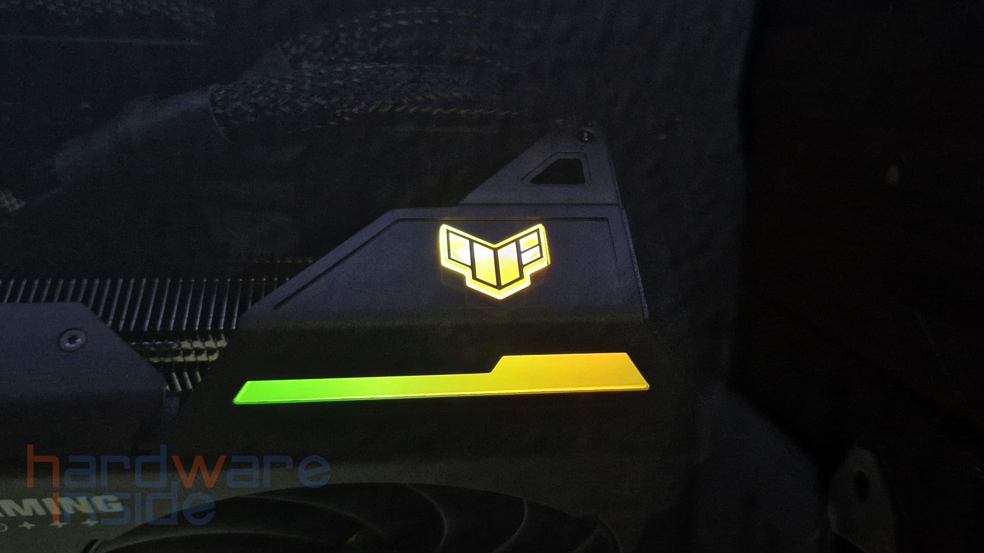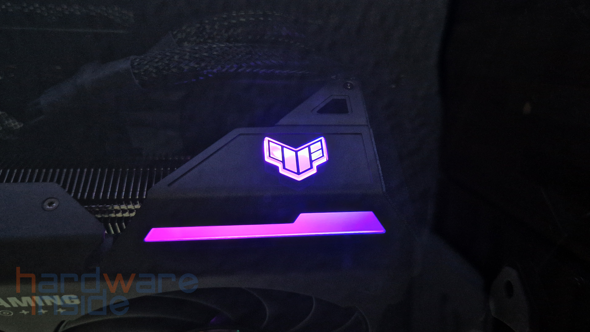 Die dezente ARGB-Beleuchtung oberhalb der seitlichen Abdeckung verleiht der Grafikkarte einen Hauch von funktionalen Effekten oder anpassbaren Farben. So fügt sich die RX 7800 XT in Form eines beleuchteten TUF-LOGOS nahtlos in ein RGB-beleuchtetes Gesamtsystem ein. Die Steuerung erfolgt über die Amoury Crate Software.