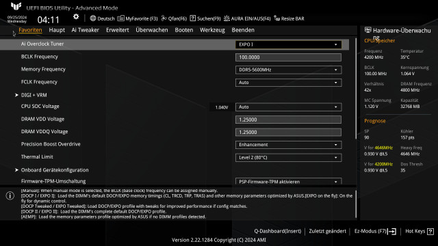Der von uns verwendete Arbeitsspeicher, der Corsair Vengeance 5600 MHz DDR5 CL36, wird vom Mainboard auf Anhieb richtig erkannt. Ab Werk würde dieser mit 5600 MHz laufen, daher ist es wichtig, vorher im UEFI das Profil EXPO 1 zu aktivieren, welches dann die Taktraten und Latenzen genau auf den Wert einstellt, den der Hersteller des Arbeitsspeichers angibt. Es gibt noch zwei weitere Profile, die dann aber mit den Timings und MHz herumspielen. Natürlich kann man den Arbeitsspeicher auch manuell übertakten, allerdings läuft unserer bereits ab 6000 MHz instabil, was auch schon auf anderen Mainboards der Fall war. Mit dem eingestellten EXPO 1 Profil läuft der Speicher in allen Anwendungen stabil und bringt eine gute Performance.