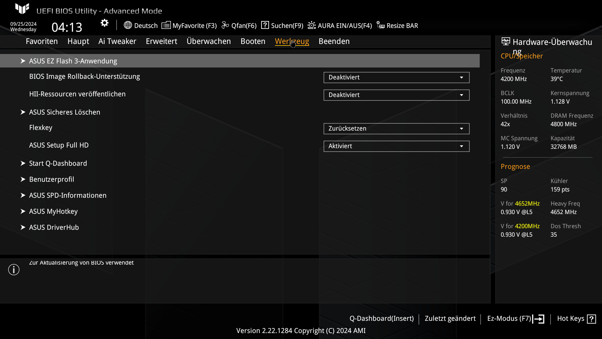 Starten wir das BIOS des ASUS TUF GAMING X870-PLUS WIFI zum ersten Mal, werden wir vom EZ-Mode begrüßt. Bereits hier haben wir diverse Einstellungsmöglichkeiten wie EXPO zu aktivieren oder die Lüfterkurven zu bearbeiten. Interessanter wird es im erweiterten Modus, der über F7 oder den Button unten rechts aufgerufen werden kann. Hier bietet UEFI dann alles, was das Enthusiastenherz begehrt. Fast jede Einstellung hat einen Infotext, auch wenn nicht alle im Detail erklären, was die jeweilige Funktion eigentlich macht. Über das X oben rechts kann man das BIOS verlassen, vorher zeigt das UEFI unsere vorgenommenen Änderungen an und fragt, ob wir uns mit unseren Änderungen sicher sind. Generell ist das UEFI gut organisiert und man findet sich recht schnell zurecht. Jede der Kategorien hat viele Untermenüs, was gerade bei der ersten Benutzung etwas nervig sein kann. Der Reiter AI-Tweaker ist hingegen nicht so verschachtelt und zeigt direkt alles Wichtige an, was für das Übertakten wichtig ist. Das UEFI kann über EZ-Flash im Tab Werkzeuge oder über den dafür vorgesehenen Button auf dem I/O-Shield des Mainboards aktualisiert werden. Beide Methoden benötigen einen USB-Stick mit der neuen BIOS-Version.
