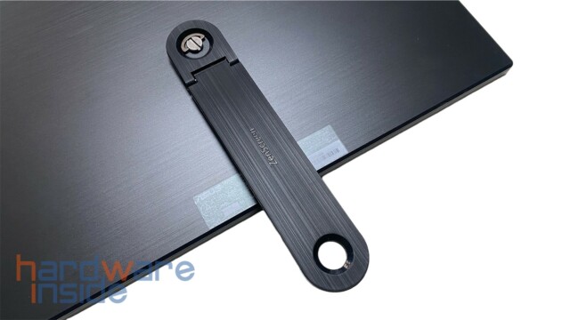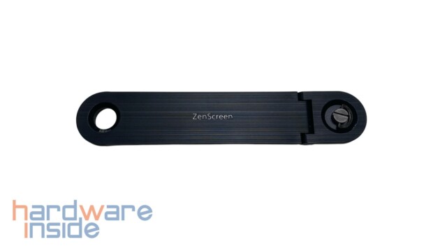 Der von ASUS genannte 360° Kickstandfuß ist von außen ebenfalls mit der Alu-Optik und den Schriftzug ZenScreen versehen worden. Mit einer Schraube wird der Stand-Fuß am Bildschirm befestigt. Am unteren Ende sorgt ein großer Fuß aus Gummi für einen sicheren Stand. Das recht starre USB-C-Anschlusskabel ist ca. 110 cm lang. Zur optischen Aufwertung besitzt das Kabel einen schwarzen Stoff-Sleeve.