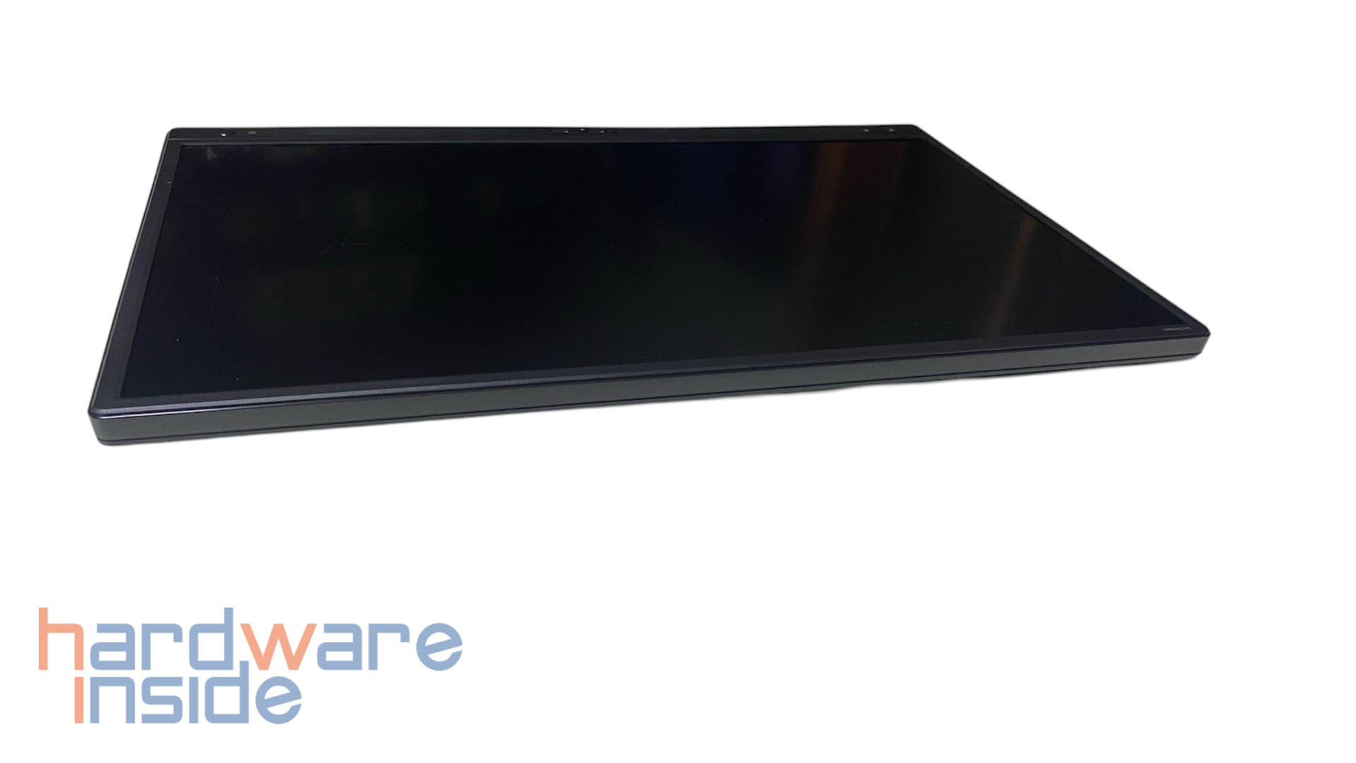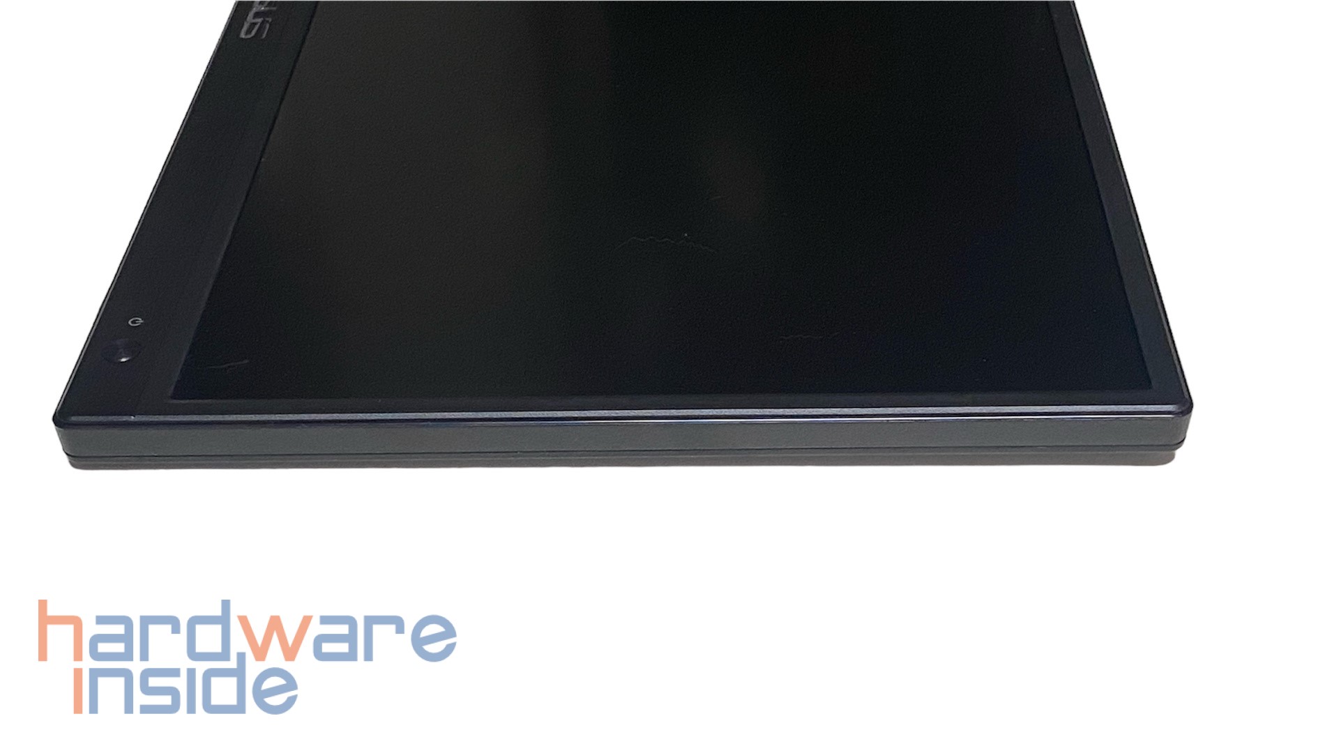 Direkt auf den ersten Blick macht der 15,6“ Bildschirm einen sehr guten Eindruck. Das Material fühlt sich wertig an. Alles ist sauber verarbeitet und es sind auch keinerlei Mängel durch den Transport zu finden. Ein großer Aufkleber an der linken unteren Ecke informiert über die wichtigsten Features. Mit einem Gewicht von nur 780 Gramm ist er angenehm leicht.