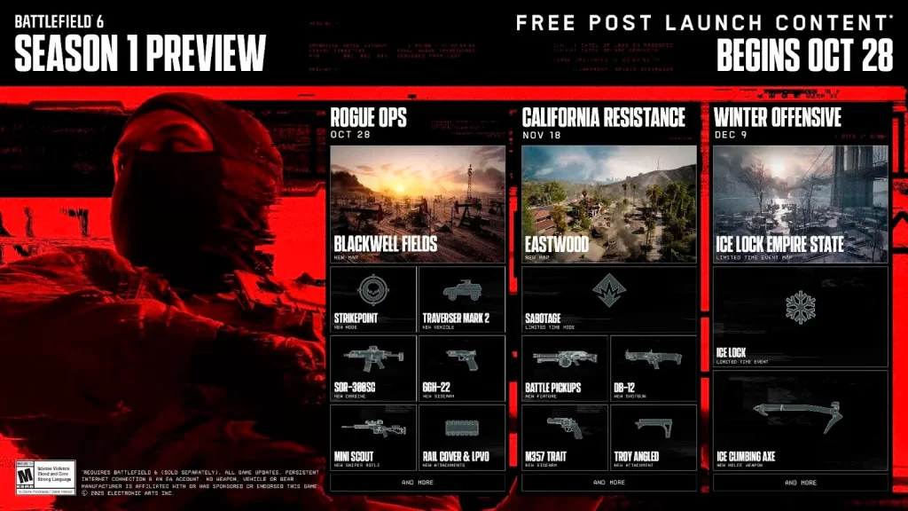 Season 1 startet am 28. Oktober und bringt neue Karten, Modi, Waffen und Events. Battlefield 6 will die Serie zu ihren Wurzeln führen: großangelegte Gefechte, taktisches Teamspiel und vielfältige Anpassungsmöglichkeiten auf PC und Konsole.