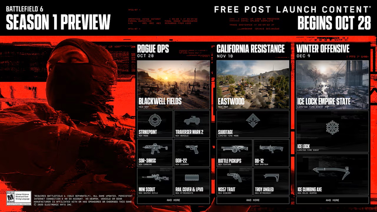 Battlefield 6 erscheint am 10. Oktober 2025, gefolgt von seinem ersten großen kostenlosen Inhalts-Update: Season 1, die am 28. Oktober auf allen Plattformen startet. Die Saison ist in drei Phasen gegliedert, die nach und nach neue Karten, Modi, Waffen, Fahrzeuge und Features einführen – sowohl für das klassische Multiplayer-Erlebnis als auch für das Portal Builder Tool, mit dem Spieler eigene Karten und Spielmodi gestalten können.