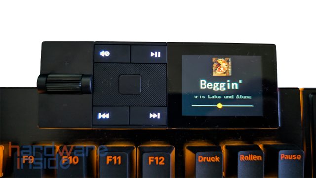 Das Mediadock ist der zweite modulare Teil des be quiet! DARK MOUNT Keyboards. Wie bereits erwähnt, lässt es sich entweder links oder rechts an der oberen Seitenkante befestigen und dient in erster Linie der Mediensteuerung. Ganz links befindet sich ein Drehrad, welches sich in Stufen dreht und die Lautstärke steuert. Rechts daneben haben wir in der Mitte eine gummierte Fläche, die zur Bedienung des Displays dient. Außerdem haben wir vier beleuchtete Knöpfe, um den Ton stumm zu schalten, einen Play/Pause-Knopf und jeweils einen Knopf, um das gerade laufende Lied oder Video zu überspringen oder zurückzuspringen. Was genau wir auf dem Display sehen und machen können, wird weiter unten erklärt.