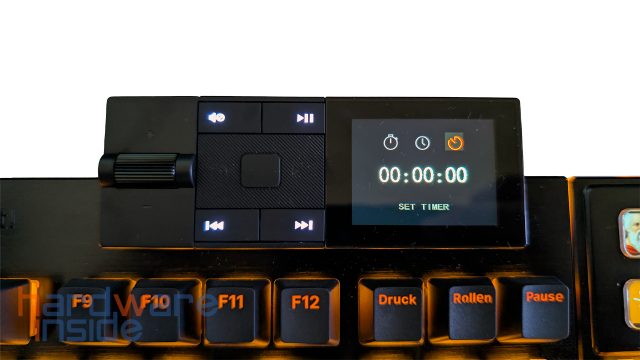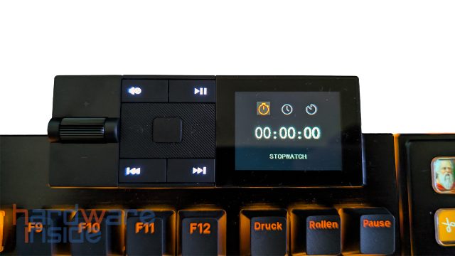 Wenn wir den gummierten Knopf in der Mitte drücken, öffnet sich das Menü des Mediadock. Die erste Option ist die Uhrenfunktion, die uns nicht nur die Uhrzeit anzeigt, sondern auch eine Stoppuhr und eine Timerfunktion bietet. Wir navigieren durch das Menü mit den gummierten Pfeiltasten und gehen zurück, indem wir zweimal auf die mittlere Taste drücken. Das zweite Menü ist das der Beleuchtung. Hier können wir einen der vordefinierten Beleuchtungseffekte auswählen. Im dritten Menü können wir die Helligkeit der Beleuchtung einstellen. Im vierten Menü können wir unsere definierten Profile laden. Diese können mit der Software eingestellt und direkt auf der Tastatur gespeichert werden. Das fünfte Menü ist die Medienansicht, in der das gerade abgespielte Medium angezeigt wird. Der sechste Menüpunkt aktiviert die „Custom“-Funktion. Dies ist wichtig, wenn wir das Mediadock mit Makrotasten ausstatten und die Funktionalität der vier beleuchteten Medientasten ändern wollen. Die Farbe der Tasten ist derzeit nicht veränderbar und leuchtet immer in einem Weißton.