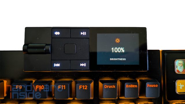 Jede der acht Zusatztasten oberhalb des Ziffernblocks hat eine Auflösung von 140 x 140 Pixel. Damit ist es problemlos möglich, beliebige Programmsymbole, aber auch eigene Bilder darzustellen, wie im Bild der Kopf von Sokrates. Jede der Tasten kann mit beliebigen Funktionen und/oder Makros belegt und dann mit einem Bild gekennzeichnet werden. Besonders Leute, die gerne streamen oder ein Streamdeck benutzen, werden dies zu schätzen wissen. Die Displays sind auch recht blickwinkelstabil, so dass es fast egal ist, aus welchem Winkel man auf sie schaut, man erkennt immer gut, welches Icon man abgelegt hat.