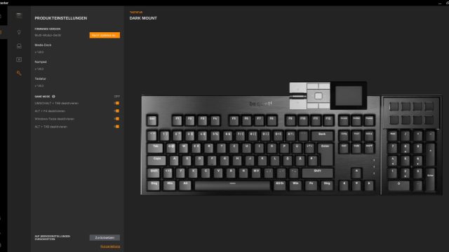 Mit der DARK MOUNT bringt be quiet! seine erste Tastatur auf den Markt. Die Tastatur ist sehr hochwertig verarbeitet und durch das modulare Konzept an viele Anwendungsfälle anpassbar. Mit den extrem leisen, eigenen Silent Switches überzeugt be quiet! vollends. Das Tippen ist sehr angenehm und mit einem Headset auf dem Kopf spürt man nur den Druck der Tasten. Dies ist eine der ersten mechanischen Tastaturen, die so leise ist und trotzdem kein Vermögen kostet. Wer bereits ein Streaming-Deck oder ähnliches sein Eigen nennt, wird vor allem die acht Zusatztasten über dem Nummernblock zu schätzen wissen. Mit der RGB-Beleuchtung versucht be quiet! auch ein neues Konzept, bei dem nicht nur die Tasten beleuchtet werden. Hinzu kommt die kompakte und intuitive Software inklusive Webversion, mit der wir die Tastatur an unsere Bedürfnisse anpassen können. Einzig die etwas umständliche Bedienung des Mediadocks und der generellen Anpassbarkeit davon trüben das ansonsten gelungene Gesamtpaket der Tastatur ein wenig. Wer also eine extrem leise und modulare Tastatur sucht, wird hier bestens bedient. Unsere Empfehlung lautet: Spitzenklasse.