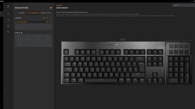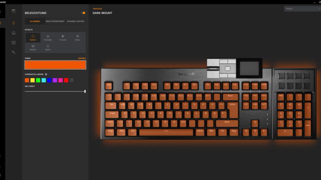 Schalten wir die Tastatur zum ersten Mal ein, leuchtet sie im Orange des be quiet! Logos auf. Die Tasten sind trotz der PBT-Tastenkappen gut beleuchtet und gerade dieser sanfte Effekt um die Schalter herum sieht sehr gut aus. Um dem Ganzen noch mehr Dynamik zu verleihen, besitzt die be quiet! DARK MOUNT eine RGB-Leiste um die gesamte Tastatur, inklusive des Nummernblocks. Jede einzelne LED darin kann angesteuert werden, was für tolle Effekte sorgt. Auch mit statischem Licht sorgt die Leiste für das gewisse Etwas.