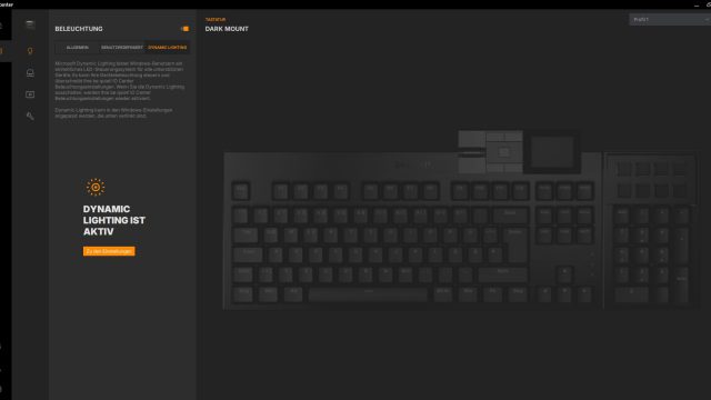 Geht man von der Hauptseite, auf der man sein Gerät auswählt, zur Beleuchtungsleiste, hat man hier die Möglichkeit aus sechs Effekten zu wählen und diese zu verändern. Auch eine Beleuchtung pro Bereich oder Taste ist im Untermenü „Benutzerdefiniert“ möglich. Hier haben wir die Möglichkeit die verschiedenen Effekte auf bis zu sieben Ebenen zu betreiben. Möchte man die Beleuchtung lieber mit Windows steuern, so ist dies mit dem Untermenü „Dynamische Beleuchtung“ möglich.