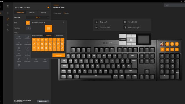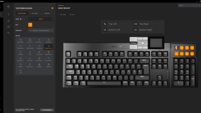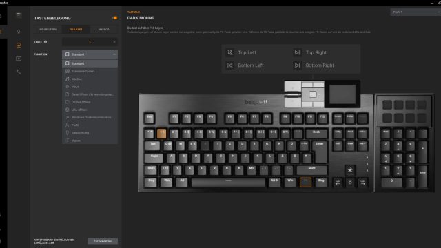 Bei der Tastenbelegung haben wir die Möglichkeit nicht nur die normalen Tasten mit Funktionalitäten zu belegen, sondern auch die des Mediadocks sowie des Numpads. Der Funktionalität sind keine Grenzen gesetzt und jeder sollte hier das finden, was er braucht. Bis zu 15 Makros, also komplexere Funktionen, können auf der Tastatur gespeichert werden. Mit dem FN-Layer können wir auch Funktionen auf Tasten legen, die nur in Kombination mit der FN-Taste ausgelöst werden. Die acht Zusatztasten des Nummernblocks sind davon leider ausgeschlossen, sie können nur eine Funktion/Makro haben.