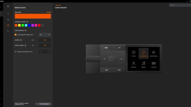 Im Menü des Mediadock können wir die Menüfarbe einstellen, nicht aber die Farbe der vier beleuchteten Tasten. Die Tasten sind leider zum Zeitpunkt des Reviews statisch beleuchtet. Wir können auch einstellen, ob eine Leerlaufgrafik angezeigt werden soll, wenn wir das Mediadock nicht benutzen. Hier haben wir die Wahl zwischen einer Uhr und einem Bild. Wir können einstellen, wann die Leerlaufgrafik angezeigt werden soll oder wann sich das Display komplett ausschalten soll.