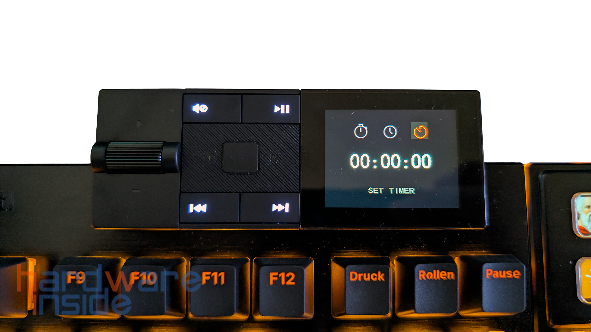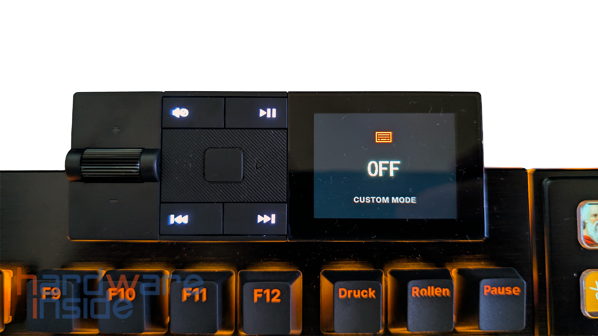 Jede der acht Zusatztasten oberhalb des Ziffernblocks hat eine Auflösung von 140 x 140 Pixel. Damit ist es problemlos möglich, beliebige Programmsymbole, aber auch eigene Bilder darzustellen, wie im Bild der Kopf von Sokrates. Jede der Tasten kann mit beliebigen Funktionen und/oder Makros belegt und dann mit einem Bild gekennzeichnet werden. Besonders Leute, die gerne streamen oder ein Streamdeck benutzen, werden dies zu schätzen wissen. Die Displays sind auch recht blickwinkelstabil, so dass es fast egal ist, aus welchem Winkel man auf sie schaut, man erkennt immer gut, welches Icon man abgelegt hat.