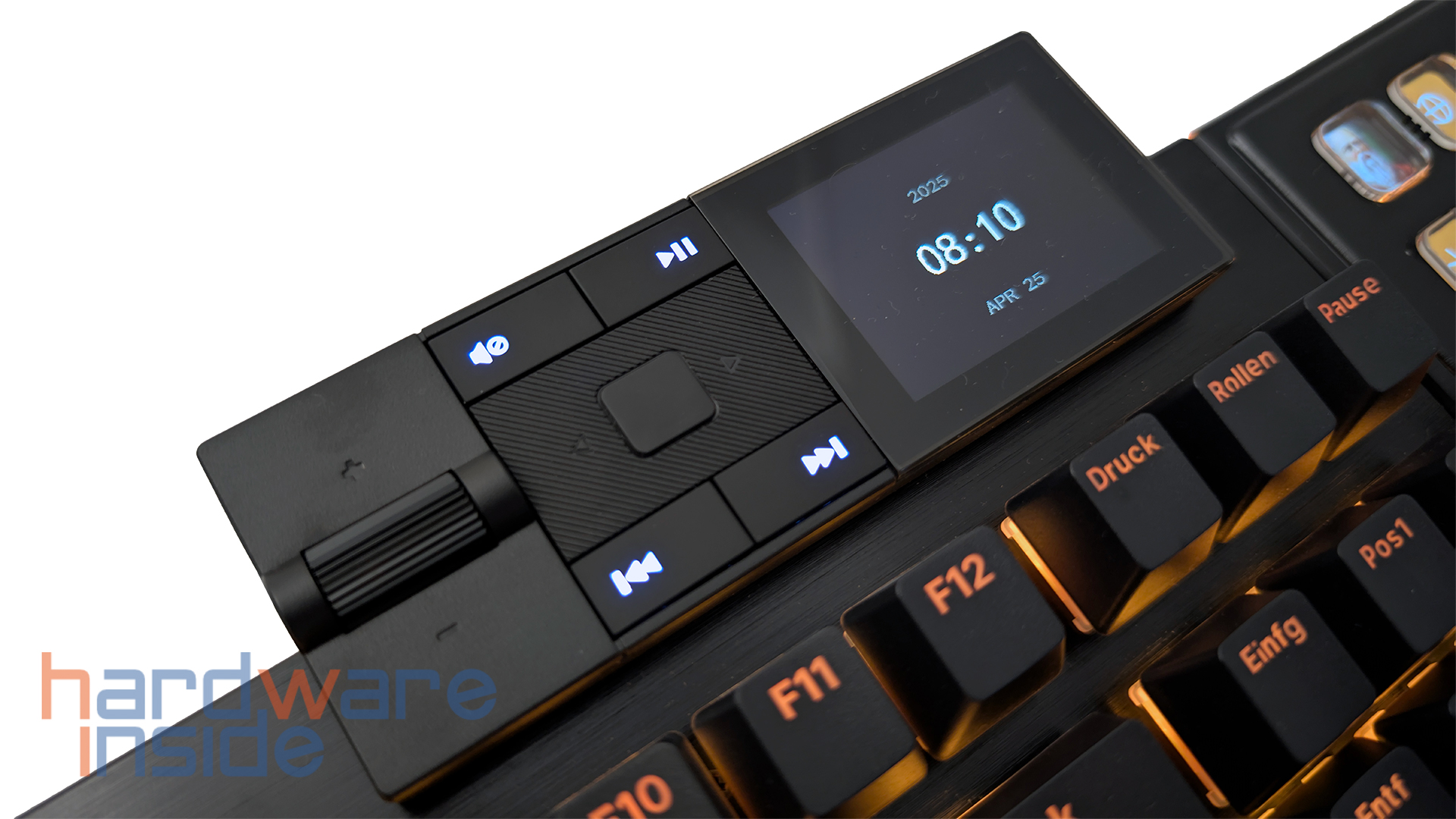 Das Mediadock ist der zweite modulare Teil des be quiet! DARK MOUNT Keyboards. Wie bereits erwähnt, lässt es sich entweder links oder rechts an der oberen Seitenkante befestigen und dient in erster Linie der Mediensteuerung. Ganz links befindet sich ein Drehrad, welches sich in Stufen dreht und die Lautstärke steuert. Rechts daneben haben wir in der Mitte eine gummierte Fläche, die zur Bedienung des Displays dient. Außerdem haben wir vier beleuchtete Knöpfe, um den Ton stumm zu schalten, einen Play/Pause-Knopf und jeweils einen Knopf, um das gerade laufende Lied oder Video zu überspringen oder zurückzuspringen. Was genau wir auf dem Display sehen und machen können, wird weiter unten erklärt.