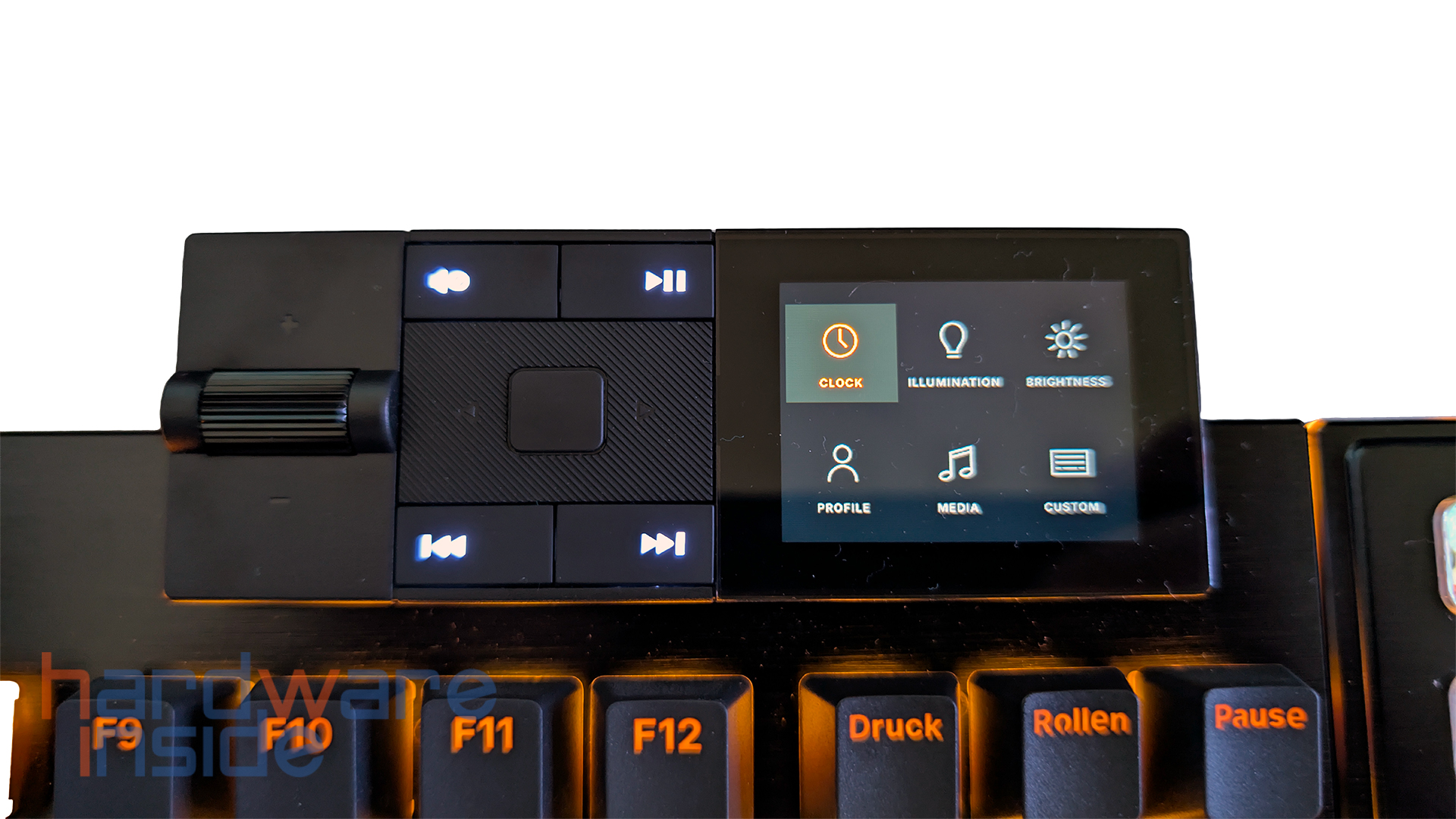 Wenn wir den gummierten Knopf in der Mitte drücken, öffnet sich das Menü des Mediadock. Die erste Option ist die Uhrenfunktion, die uns nicht nur die Uhrzeit anzeigt, sondern auch eine Stoppuhr und eine Timerfunktion bietet. Wir navigieren durch das Menü mit den gummierten Pfeiltasten und gehen zurück, indem wir zweimal auf die mittlere Taste drücken. Das zweite Menü ist das der Beleuchtung. Hier können wir einen der vordefinierten Beleuchtungseffekte auswählen. Im dritten Menü können wir die Helligkeit der Beleuchtung einstellen. Im vierten Menü können wir unsere definierten Profile laden. Diese können mit der Software eingestellt und direkt auf der Tastatur gespeichert werden. Das fünfte Menü ist die Medienansicht, in der das gerade abgespielte Medium angezeigt wird. Der sechste Menüpunkt aktiviert die „Custom“-Funktion. Dies ist wichtig, wenn wir das Mediadock mit Makrotasten ausstatten und die Funktionalität der vier beleuchteten Medientasten ändern wollen. Die Farbe der Tasten ist derzeit nicht veränderbar und leuchtet immer in einem Weißton.
