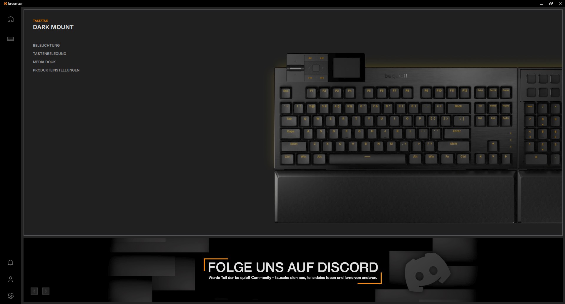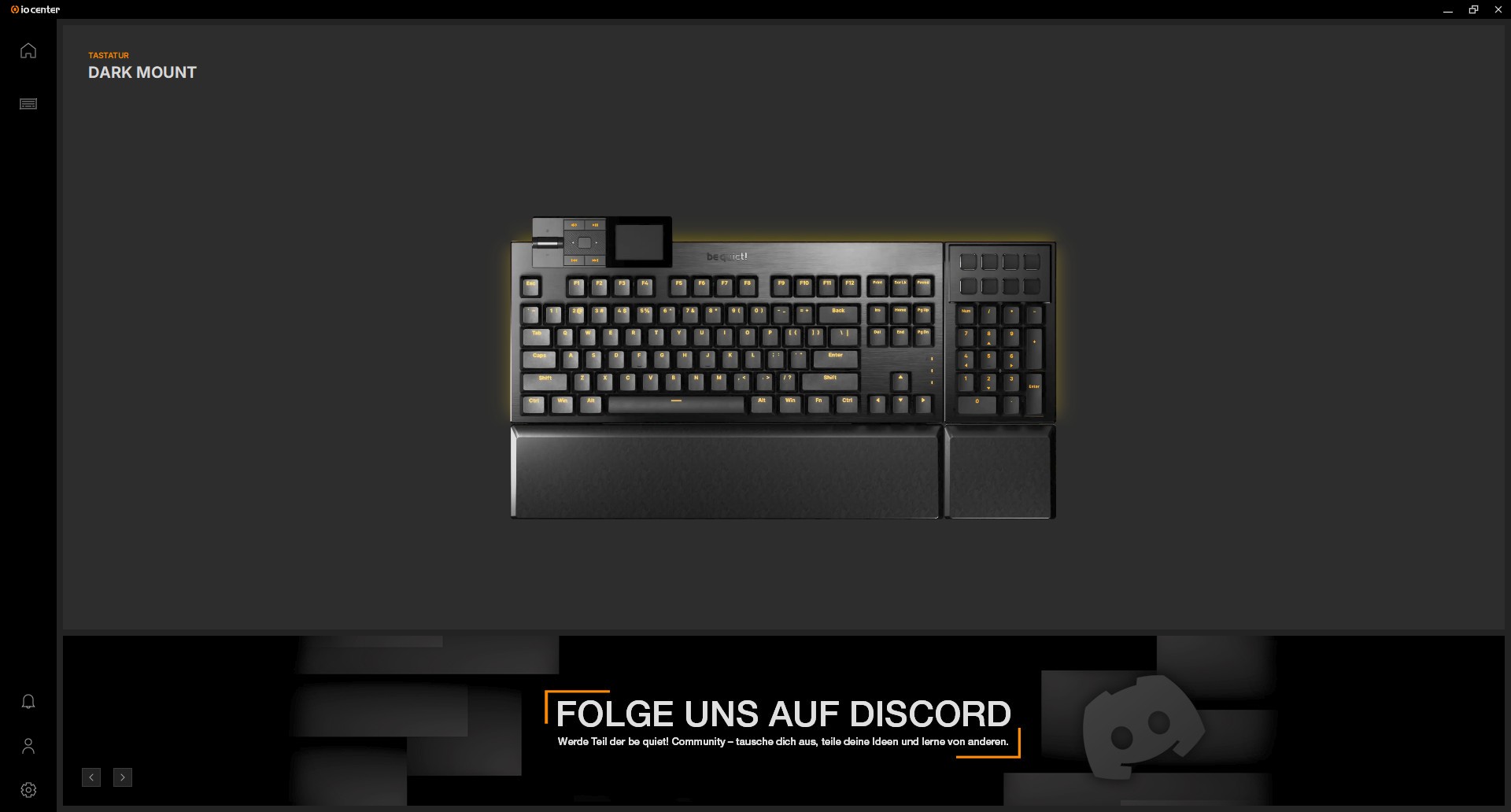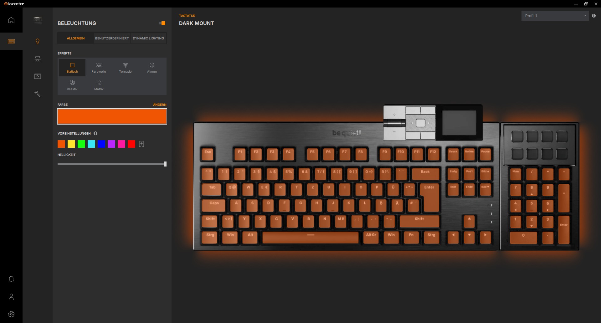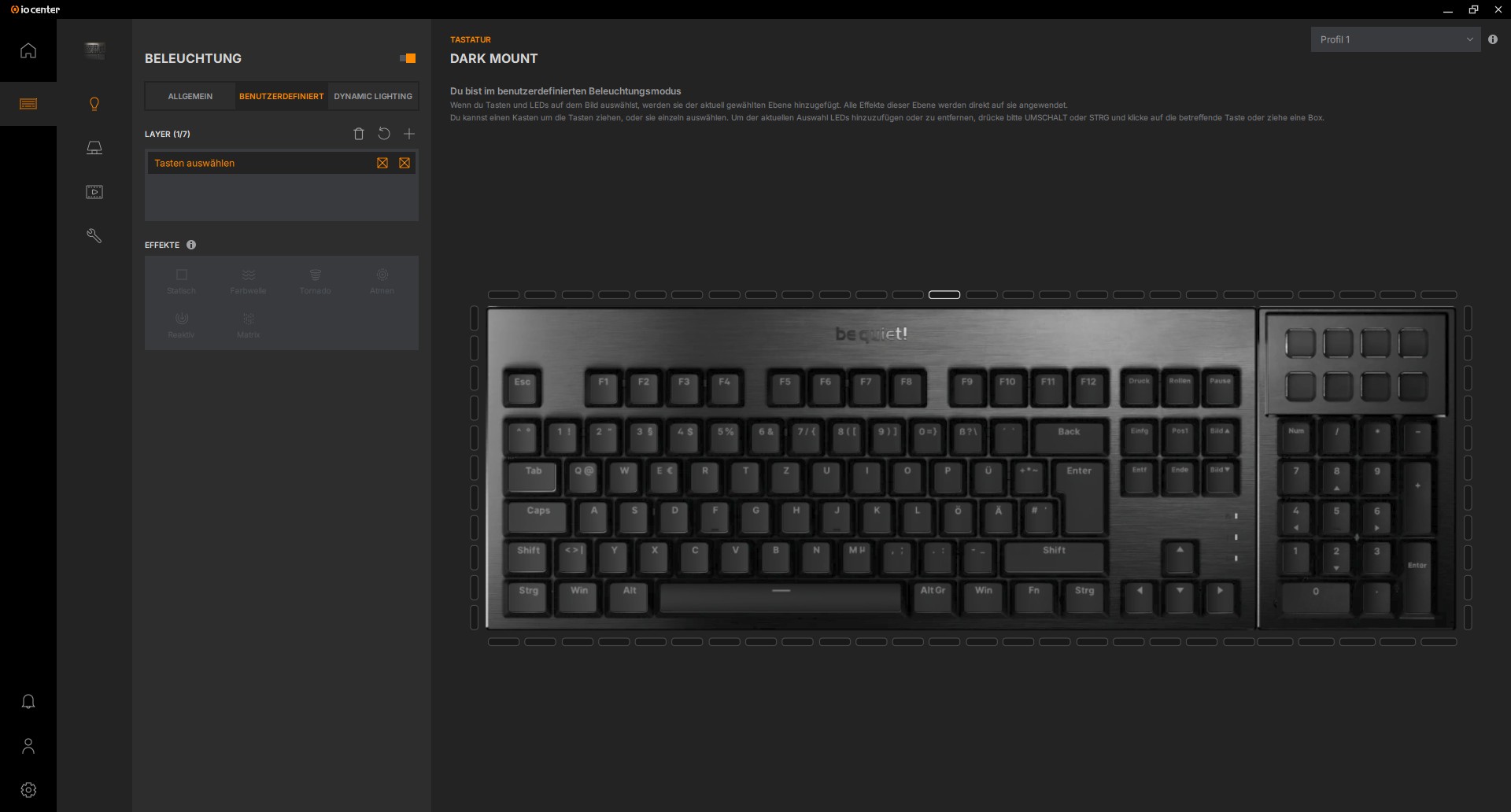 Schalten wir die Tastatur zum ersten Mal ein, leuchtet sie im Orange des be quiet! Logos auf. Die Tasten sind trotz der PBT-Tastenkappen gut beleuchtet und gerade dieser sanfte Effekt um die Schalter herum sieht sehr gut aus. Um dem Ganzen noch mehr Dynamik zu verleihen, besitzt die be quiet! DARK MOUNT eine RGB-Leiste um die gesamte Tastatur, inklusive des Nummernblocks. Jede einzelne LED darin kann angesteuert werden, was für tolle Effekte sorgt. Auch mit statischem Licht sorgt die Leiste für das gewisse Etwas.