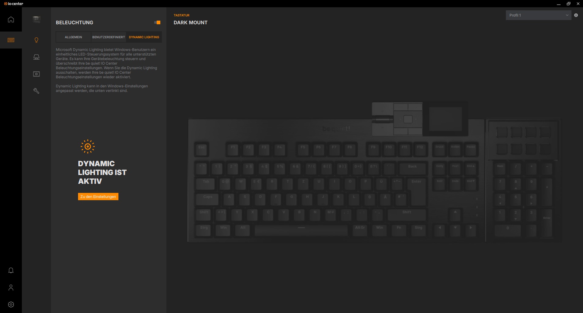 be quiet! setzt auf eine möglichst schlanke Software. Genau aus diesem Grund gibt es auch eine Webversion der Software, so dass keine Software installiert werden muss. Lediglich Windows Dynamic Lightning ist über die Webversion nicht verfügbar, aber alles andere soll wie mit der Software funktionieren, wie z. B. ein Softwareupdate. Die Software ist sehr intuitiv aufgebaut und wirkt nicht überladen. Alles ist schnell zu finden, die Icons sind selbsterklärend und bei Bedarf gibt es an vielen Stellen einen kleinen Info-Button, um zusätzliche Informationen zu erhalten.