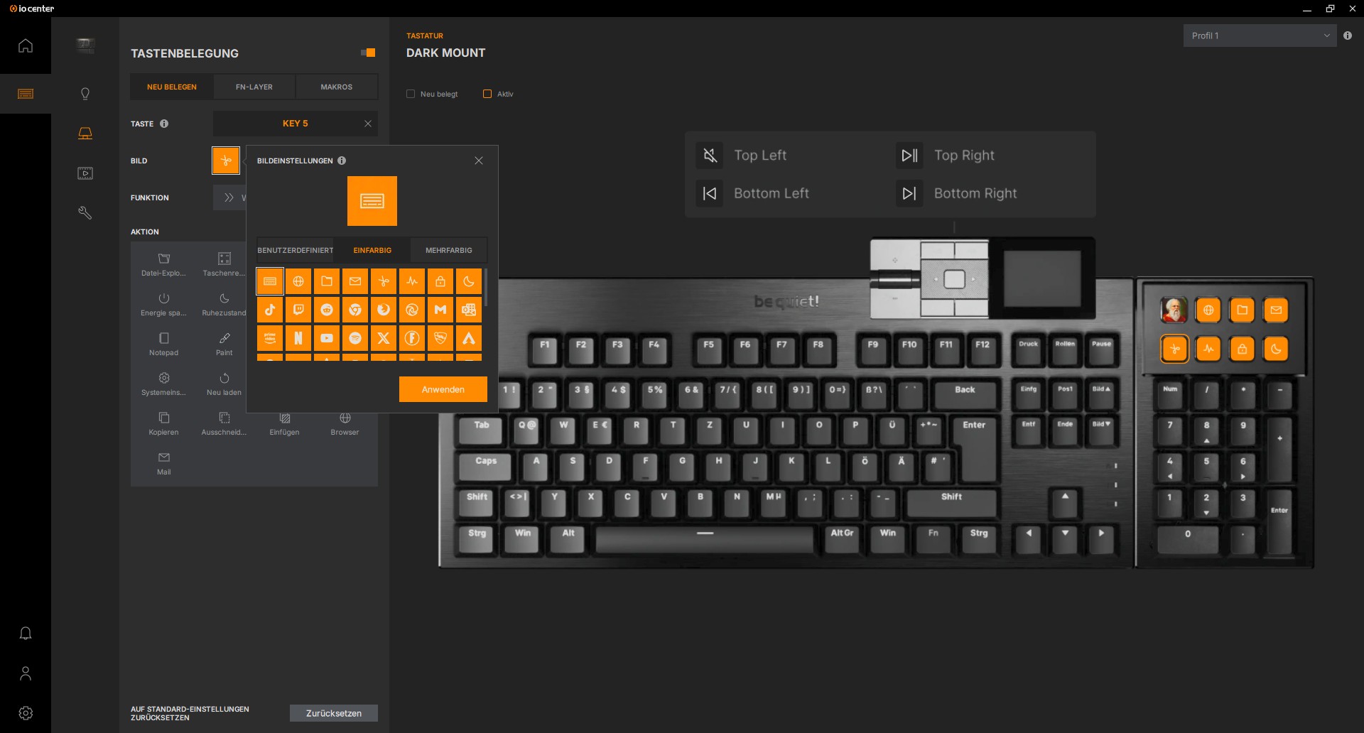 Profile können unten links in der Software erstellt, gelöscht und exportiert werden. Das Profil selbst kann über das gleiche Menü oder im jeweiligen Einstellungsfenster für die Tastaturfunktionen oben rechts ausgewählt werden.