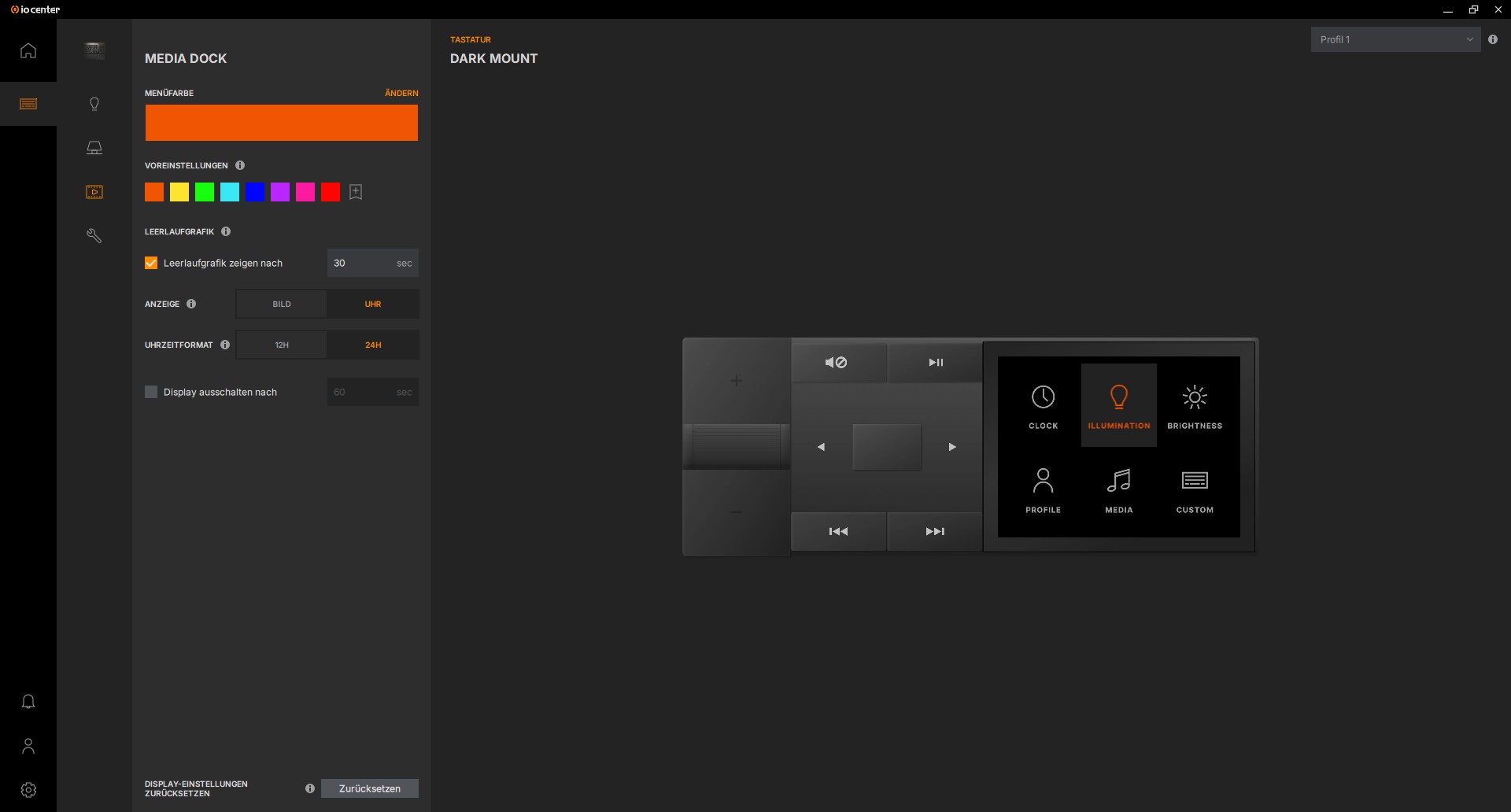 Im Menü des Mediadock können wir die Menüfarbe einstellen, nicht aber die Farbe der vier beleuchteten Tasten. Die Tasten sind leider zum Zeitpunkt des Reviews statisch beleuchtet. Wir können auch einstellen, ob eine Leerlaufgrafik angezeigt werden soll, wenn wir das Mediadock nicht benutzen. Hier haben wir die Wahl zwischen einer Uhr und einem Bild. Wir können einstellen, wann die Leerlaufgrafik angezeigt werden soll oder wann sich das Display komplett ausschalten soll.