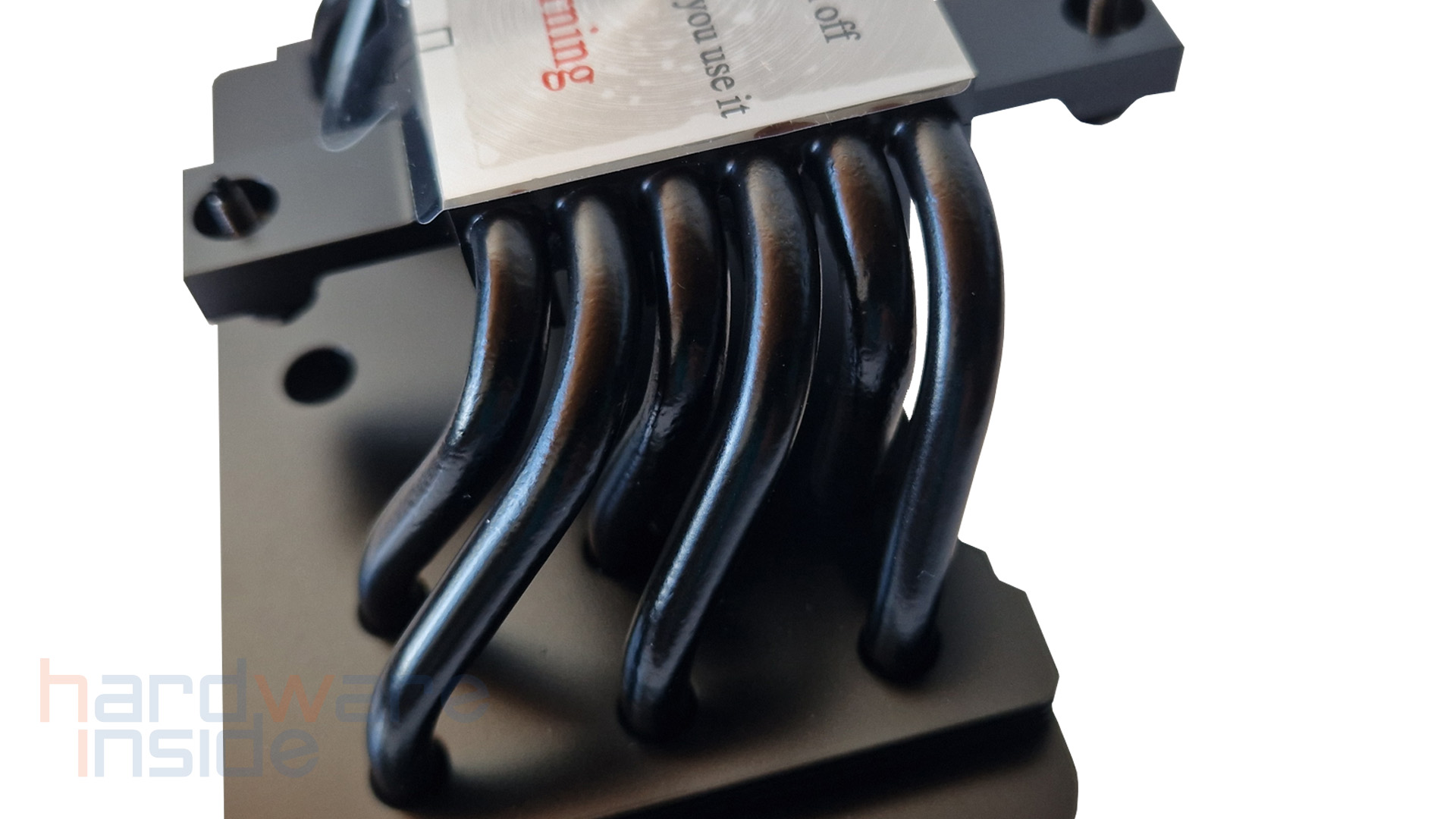 Dank einer vernickelten Kühlplatte ist der Dark Rock 5 mit Flüssigmetall-Wärmeleitpaste kompatibel. Im Auslieferungszustand ist diese mit einem Warnhinweis-Aufkleber versehen. Vor der Montage sollte dieser natürlich entfernt werden.
