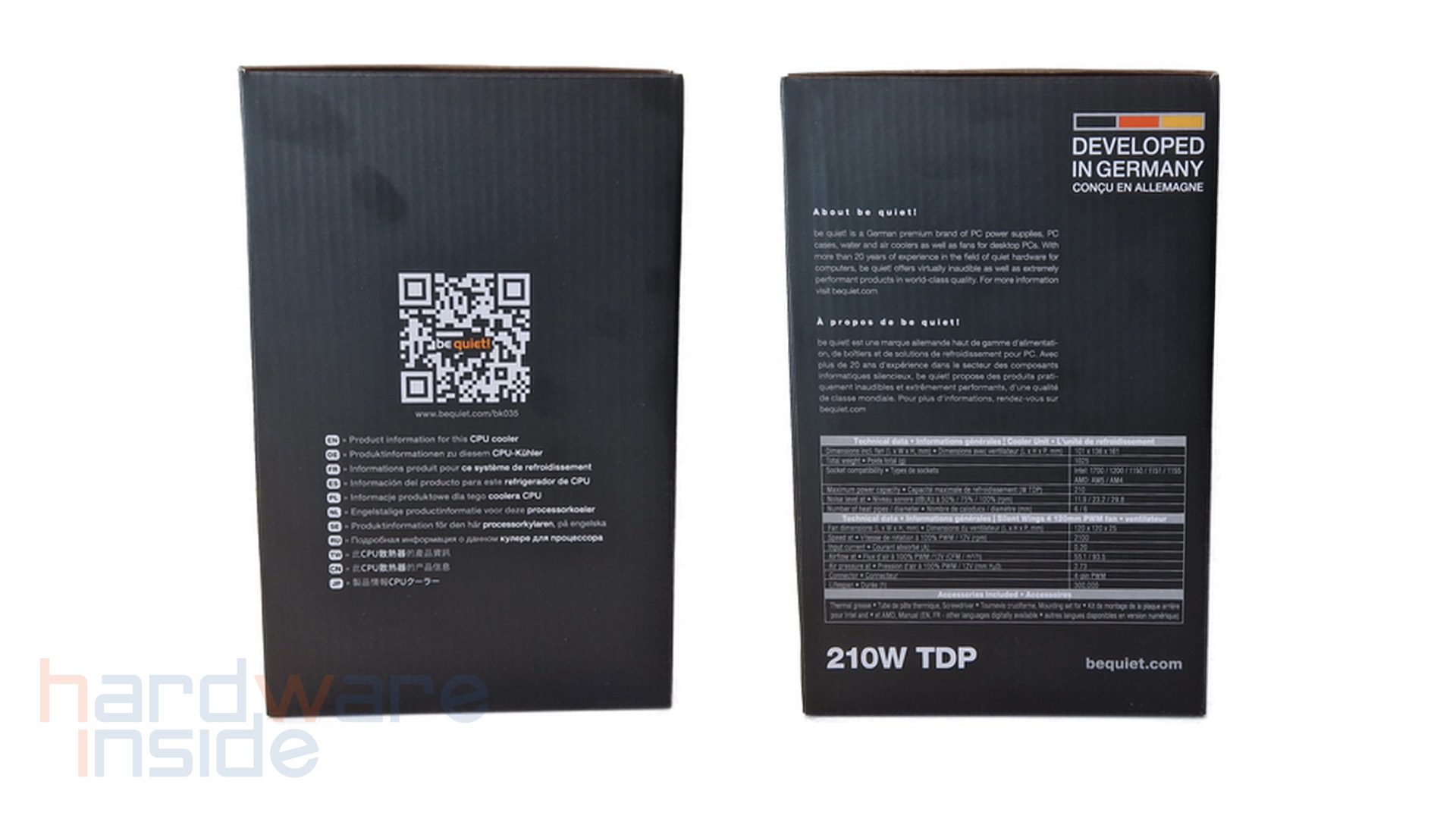 Auf einer der Längsseiten befindet sich ein QR-Code über den die Produktinformationen des CPU-Kühlers auf der be quiet! Seite zu erreichen sind, diese werden in 11 unterschiedlichen Sprachen aufgelistet. Auf der anderen Seite geht man noch über die Firmenphilosophie von be quiet! ein und die technischen Daten in Form einer Tabelle aufgelistet. Groß in Weiß der Vermerk der TDP von 210 W.