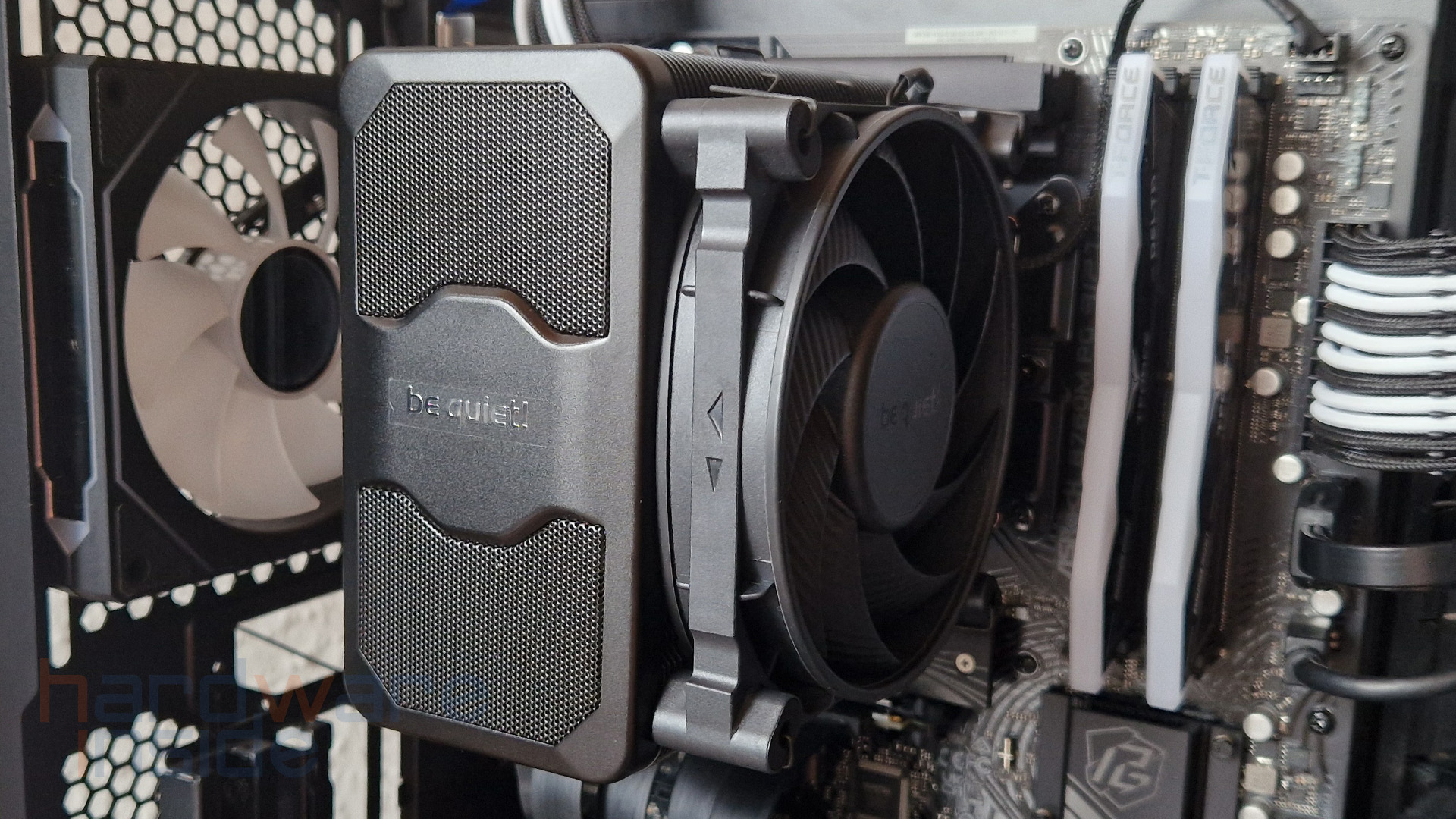 Die Installation ist doch recht einfach und gut durchdacht. Oberhalb des Kühlers sitzt eine magnetische Mesh-Abdeckung, so zeigt es bei der Entnahme gleichzeitig das verdeckte Ende der Heatpipes und das Schraubenloch für die Montage. Nach der Entnahme steht der Montage nichts mehr im Wege.