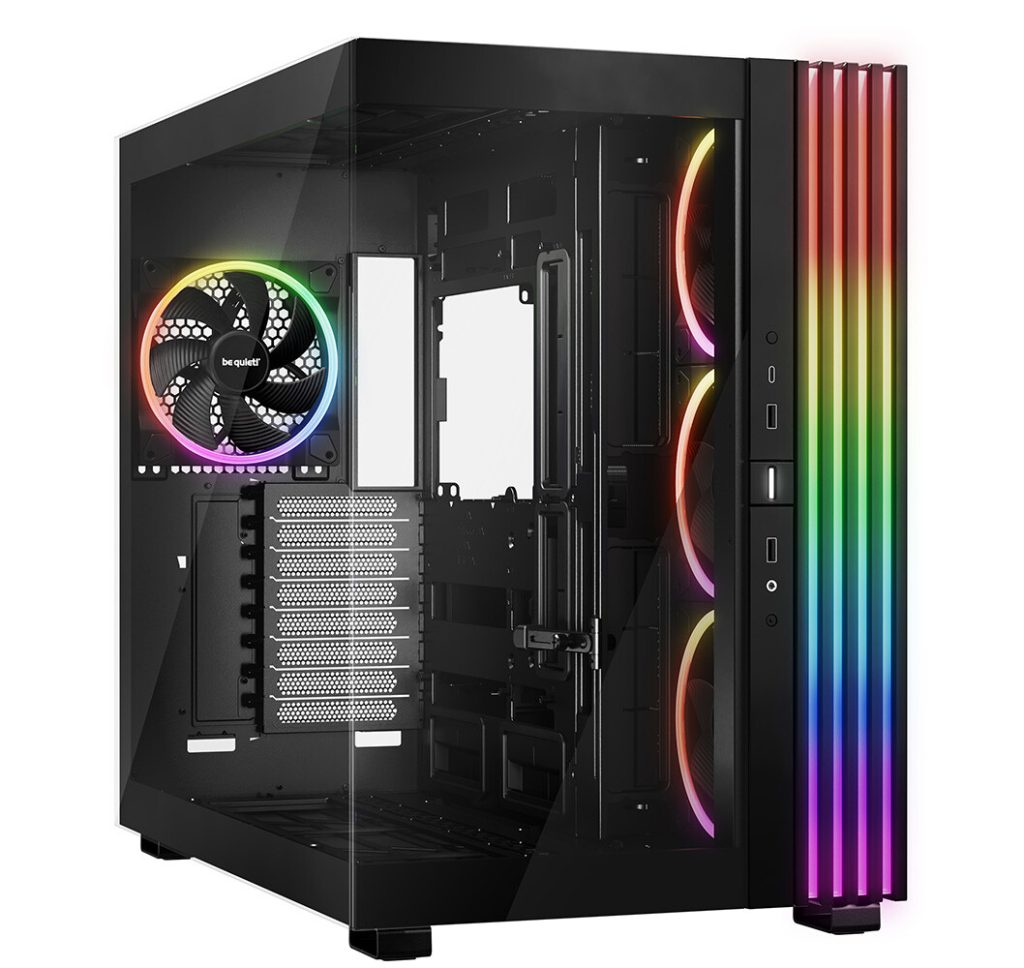Glinde, 26. September 2024 – be quiet!, der deutsche Hersteller für Premium-PC-Komponenten, präsentiert voller Stolz die Light Base PC-Gehäuseserie im Showcase-Design, die speziell für Hardware-Enthusiasten entwickelt wurde, die die verbauten Komponenten in ihrer ganzen optischen Pracht genießen möchten. Die Serie besteht aus dem Light Base 900 FX, dem Light Base 900 DX, dem Light Base 600 LX und dem Light Base 600 DX, wobei jedes Modell über vollverglaste Front- und Seitenteile verfügt. Der Wechsel zwischen normalem, invertiertem oder horizontalem Layout ist dank der außergewöhnlich einfachen Invertierungsoptionen eine Sache von Sekunden. Der extravagante ARGB-Streifen, der das Gehäuse umgibt, sorgt für eine eindrucksvolle Beleuchtung. Vielseitigkeit und Benutzerfreundlichkeit auf höchstem NiveauDie Light Base Serie bietet ein vollständig verglastes Showcase-Design, das einen atemberaubenden Blick auf die eingebauten Komponenten ermöglicht. Jedes Gehäusemodell bietet drei verschiedene Ausrichtungen: normal (rechte Seite), invertiert (linke Seite) oder horizontal (Desktop-Stil). Der Wechsel zwischen diesen Ausrichtungen ist, dank der einzigartig gestalteten und leicht abnehmbaren Füße eine Sache von Sekunden. Um das Innenleben des Systems hervorzuheben, bietet die Light Base Serie durchdachte Features, wie einen diskreten VGA-Halter, der seine Funktion in allen Ausrichtungen des Gehäuses beibehält. Außerdem sind zwei ARGB-/Lüfter-Hubs mit insgesamt 12 Anschlüssen, die Unterstützung für ein 3,5“- und zwei 2,5“-Laufwerke sowie benutzerfreundliche und leicht zu reinigende Staubfilter vormontiert. Darüber hinaus bietet der Mainboard-Tray volle Unterstützung für alle auf dem Markt erhältlichen Mainboard-Designs mit rückseitigen Anschlüssen wie Asus BTF, MSI Project Zero und Gigabyte Project Stealth. Ein modernes I/O-Panel beinhaltet neben einem USB 3.2 Gen 2 Typ C Anschluss und einen ARGB-Controller-Button. Dank eines riesigen ARGB-Streifens, der sich um das Gehäuse legt, bieten die Light Base Gehäuse beeindruckende Beleuchtungsoptionen mit verschiedensten Lichteffekten.