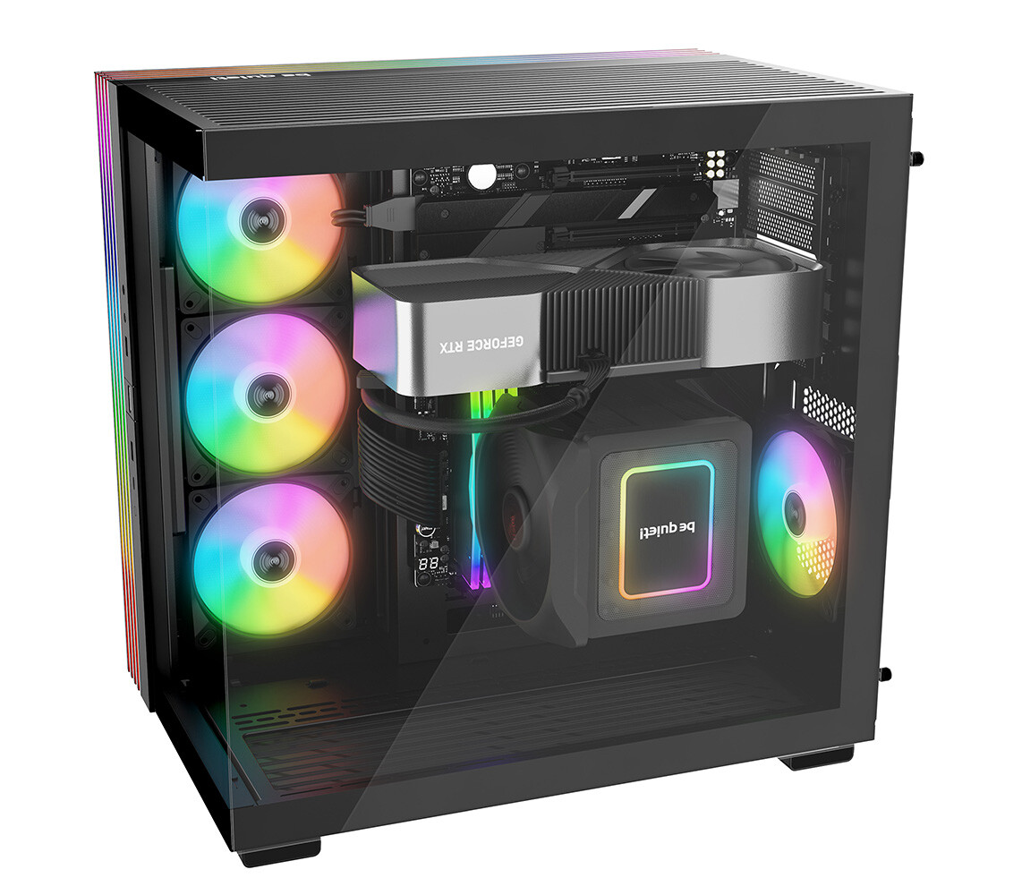 Glinde, 26. September 2024 – be quiet!, der deutsche Hersteller für Premium-PC-Komponenten, präsentiert voller Stolz die Light Base PC-Gehäuseserie im Showcase-Design, die speziell für Hardware-Enthusiasten entwickelt wurde, die die verbauten Komponenten in ihrer ganzen optischen Pracht genießen möchten. Die Serie besteht aus dem Light Base 900 FX, dem Light Base 900 DX, dem Light Base 600 LX und dem Light Base 600 DX, wobei jedes Modell über vollverglaste Front- und Seitenteile verfügt. Der Wechsel zwischen normalem, invertiertem oder horizontalem Layout ist dank der außergewöhnlich einfachen Invertierungsoptionen eine Sache von Sekunden. Der extravagante ARGB-Streifen, der das Gehäuse umgibt, sorgt für eine eindrucksvolle Beleuchtung. Vielseitigkeit und Benutzerfreundlichkeit auf höchstem NiveauDie Light Base Serie bietet ein vollständig verglastes Showcase-Design, das einen atemberaubenden Blick auf die eingebauten Komponenten ermöglicht. Jedes Gehäusemodell bietet drei verschiedene Ausrichtungen: normal (rechte Seite), invertiert (linke Seite) oder horizontal (Desktop-Stil). Der Wechsel zwischen diesen Ausrichtungen ist, dank der einzigartig gestalteten und leicht abnehmbaren Füße eine Sache von Sekunden. Um das Innenleben des Systems hervorzuheben, bietet die Light Base Serie durchdachte Features, wie einen diskreten VGA-Halter, der seine Funktion in allen Ausrichtungen des Gehäuses beibehält. Außerdem sind zwei ARGB-/Lüfter-Hubs mit insgesamt 12 Anschlüssen, die Unterstützung für ein 3,5“- und zwei 2,5“-Laufwerke sowie benutzerfreundliche und leicht zu reinigende Staubfilter vormontiert. Darüber hinaus bietet der Mainboard-Tray volle Unterstützung für alle auf dem Markt erhältlichen Mainboard-Designs mit rückseitigen Anschlüssen wie Asus BTF, MSI Project Zero und Gigabyte Project Stealth. Ein modernes I/O-Panel beinhaltet neben einem USB 3.2 Gen 2 Typ C Anschluss und einen ARGB-Controller-Button. Dank eines riesigen ARGB-Streifens, der sich um das Gehäuse legt, bieten die Light Base Gehäuse beeindruckende Beleuchtungsoptionen mit verschiedensten Lichteffekten.