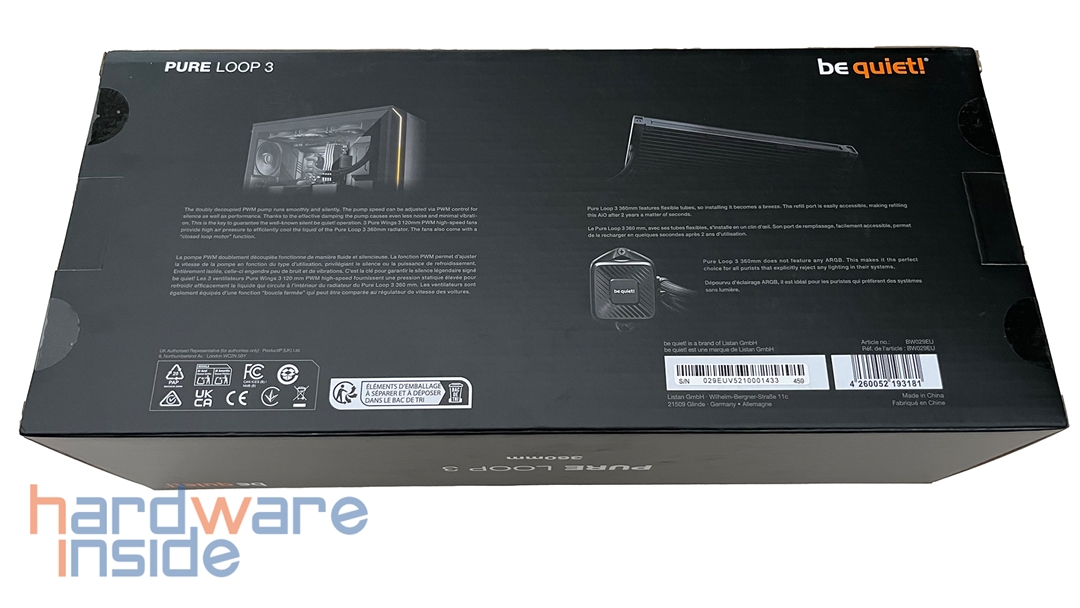Die Vorderseite zeigt ein großes, zentriertes Produktbild der Pure Loop 3 360 mm, das sich durch seine schlichte und zugleich präzise Darstellung auszeichnet. Hier verzichtet be quiet! auf überladenes Marketing und setzt stattdessen auf eine klare, informative Darstellung, ganz im Stil der eigenen Philosophie. Auf der Rückseite wird es dann etwas technischer: Hier listet der Hersteller die wichtigsten Features der AiO in kurzen, prägnanten Punkten auf. Dazu zählen unter anderem die regelbare Pumpe, die neuen Pure Wings 3 High-Speed-Lüfter sowie der Nachfüllport. Statt reißerischer Versprechen liegt der Fokus auf sachlichen Informationen – typisch be quiet!, typisch bodenständig. Ergänzt wird das Ganze durch eine Übersicht der technischen Spezifikationen sowie kleinere Produktabbildungen, die Details wie die Lüfter oder den Pumpendeckel hervorheben.