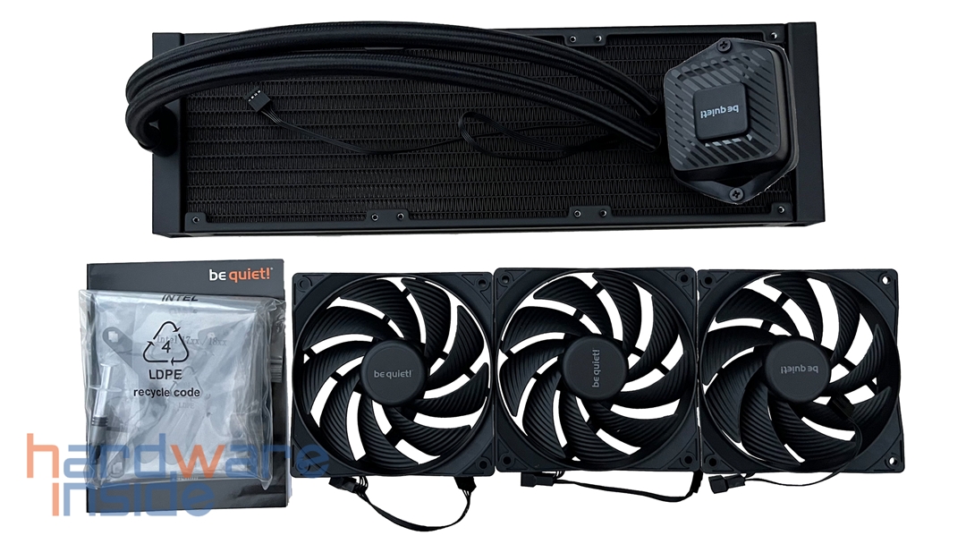 Im Zentrum des Lieferumfangs steht natürlich die Radiator-Pumpen-Einheit, die bereits mit den Schläuchen verbunden ist. be quiet! setzt hier auf das bewährte Design mit entkoppelter Pumpe, die im Schlauchsystem sitzt, um Vibrationen vom CPU-Kühler fernzuhalten. Der Radiator selbst kommt im klassischen 360-mm-Format und besteht aus schwarzem Aluminium mit einer feinen Lamellenstruktur. Ebenfalls im Karton befinden sich drei Pure Wings 3 120 mm High-Speed-Lüfter, die für einen ausgewogenen Mix aus hohem statischen Druck und leiser Laufkultur sorgen sollen. Abgerundet wird der Lieferumfang durch das Montagematerial für alle gängigen Sockel von AMD und Intel. Neben AM4 und AM5 werden auch LGA 115x, 1200, 1700 und der gegenwärtige 1851-Sockel unterstützt. Die Halterungen wirken robust und sind klar beschriftet, was den Einbau erleichtert. Passend dazu legt be quiet! eine kleine Tube Wärmeleitpaste, eine mehrsprachige Anleitung sowie das nötige Schrauben- und Kabelzubehör bei.