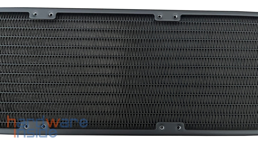 Der 360-mm-Radiator der Pure Loop 3 präsentiert sich durchweg sauber verarbeitet. Auffällige scharfe Kanten sucht man vergeblich, alle Kanten sind sauber abgerundet und vermitteln einen hochwertigen Eindruck. Auch die Lamellen sind durchweg tadellos: gleichmäßig, unbeschädigt und ohne Knicke oder Verschiebungen. Die Konstruktion wirkt robust und stabil, was einen problemlosen Einbau ermöglicht und die Langlebigkeit des Radiators unterstützt. Insgesamt hinterlässt der Radiator einen soliden, funktionalen Eindruck, der sich nahtlos in das Gesamtkonzept der AiO einfügt. Ein praktisches Detail des Radiators ist der integrierte Nachfüllport. Damit lässt sich die Kühlflüssigkeit bei Bedarf unkompliziert ergänzen, ohne dass die AiO dafür komplett demontiert werden muss – ein Feature, das in dieser Preisklasse längst nicht selbstverständlich ist.