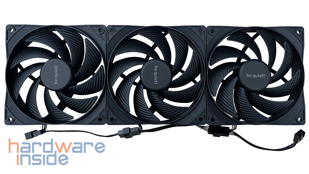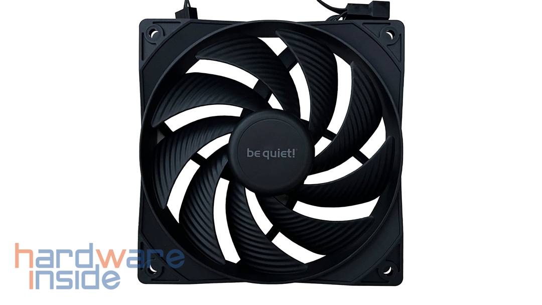 Die Pure Wings 3 120 mm High-Speed Lüfter hinterlassen einen insgesamt soliden, funktionalen Eindruck. Sie wirken sauber verarbeitet, die mattschwarze Oberfläche passt gut zum Design der AiO, und die Blätter laufen ruhig und gleichmäßig. Die Lüfter sind für einen Mittelklasse-Aufbau konzipiert: sie kombinieren guten statischen Druck mit einer moderaten Lautstärke, sind aber klar keine High-End-Modelle. Die Struktur der Lüfterblätter ist typisch für be quiet!. Leicht gebogen, mit feinen Kanten, um den Luftfluss effizient durch die Lamellen des Radiators zu lenken. In der Praxis sorgt das für einen soliden Kompromiss aus Leistung und Lautstärke. Ein Manko im Mittelklasse-Bereich ist die Entkopplung: Es fehlen die sonst üblichen Gummiecken, wie man sie bei hochwertigen Lüftern findet, um Vibrationen und Körperschall weiter zu reduzieren. Dadurch übertragen die Lüfter bei höheren Drehzahlen leicht Vibrationen auf das Gehäuse.