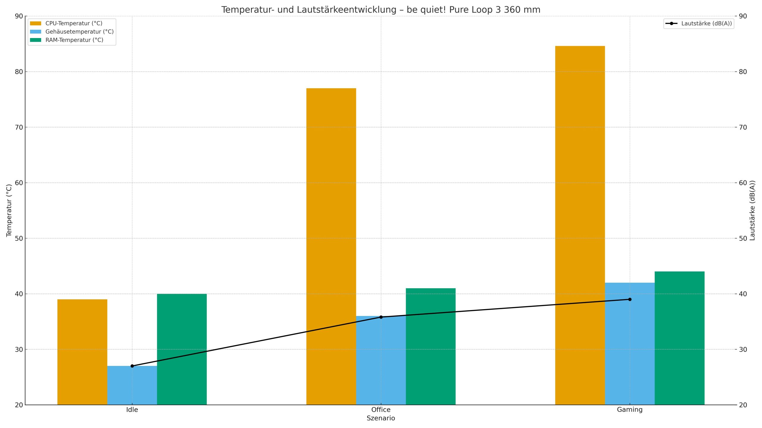 Die Messungen erfolgen in drei typischen Szenarien: Idle, Office/Alltagsbetrieb und Gaming/Volllast. So lässt sich sowohl die Effizienz der Pure Loop 3 360 mm als auch das Geräuschverhalten unter unterschiedlichen Belastungen realistisch einschätzen. Ziel ist es, ein Gesamtbild zu zeichnen, wie sich AiO und Gehäuse im Alltag, sowohl thermisch als auch akustisch, und bei anspruchsvollen Anwendungen verhalten.