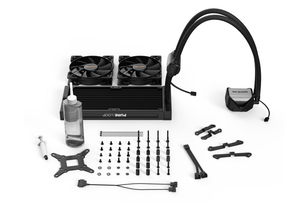 Pure Loop-Wasserkühlungen setzen auf eine zweifach entkoppelte Pumpe, um die Übertragung von Vibrationen so gering wie möglich zu halten. Das Pumpengehäuse ist durch die Aufhängung an den Schläuchen vom CPU-Kühlblock und Radiator entkoppelt. Zusätzlich sorgt eine Gummi-Schalldämpfung in der Pumpeneinheit für eine Entkopplung. Außerdem verbaut be quiet! bis zu drei Pure Wings 2-Lüfter mit jeweils neun optimierten Lüfterblättern für optimalen Luftstrom und sehr leisen Betrieb. Eine vernickelte Bodenplatte sorgt für effiziente Kühlung sämtlicher Mainstream-Desktop-Prozessoren und ermöglicht außerdem den Einsatz von Wärmeleitpaste aus Flüssigmetall.