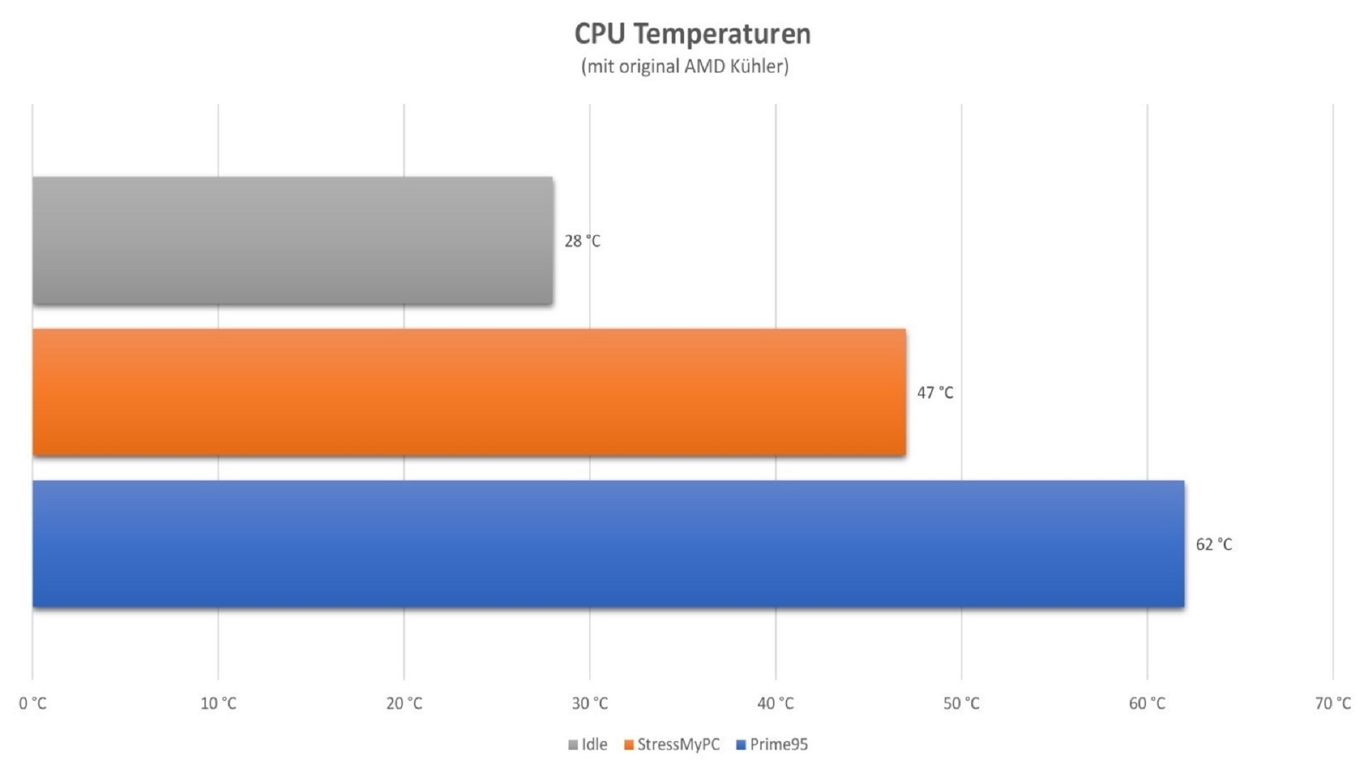 Mit dem be quiet! SHADOW ROCK SLIM erreichen wir eine maximale Temperatur von knapp 48 °C und damit etwa 14 °C weniger als mit dem AMD Stock Kühler. Mit einer Übertaktung auf 4.000 MHz, auf allen Kernen, erreichen wir eine maximale Temperatur von 58 °C. Dies führt dazu, dass der Lüfter unter Alltagsbedingungen nicht hochdreht und damit absolut leise ist.