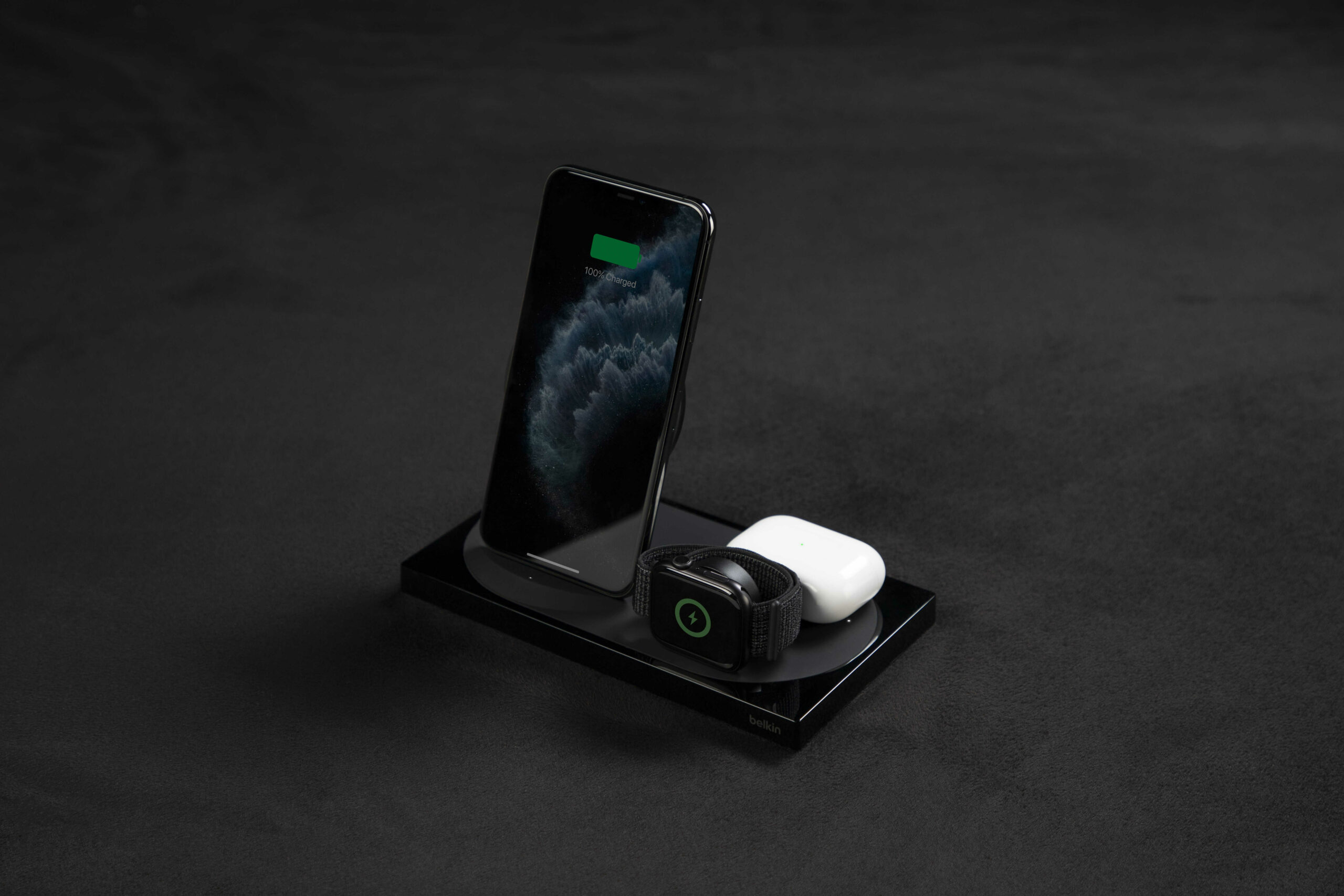 Mit der Sonderausgabe des drahtlosen BOOST CHARGE 3-in-1-Ladegeräts lassen sich mit iPhone, Apple Watch und AirPods gleichzeitig drei Geräte mit optimaler Geschwindigkeit drahtlos aufladen. Auch diese Station ist Qi-zertifiziert und mit AirPods Pro, AirPods mit Wireless Charging Case sowie den meisten Schutzhüllen bis zu einer Dicke von drei Millimetern kompatibel. Eine LED-Leuchte zeigt den Ladestatus an.