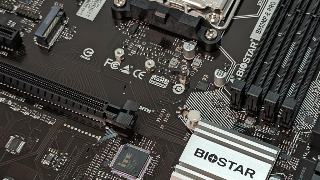 Betrachtet man das Gesamtbild des Biostar B650MP-E Pro, so fällt schnell auf, dass wir uns im Low-Budget Bereich mit Fokus auf Preis/Leistung befinden. Insgesamt zieren zwei Kühlkörper das Mainboard, wobei der des Chipsatzes den Biostar Schriftzug trägt. Als praktisch erweisen sich die, um 90° gedrehten, SATA-Anschlüsse, welche die einzigen gedrehten bzw. versteckten Anschlüsse am Biostar B650MP-E Pro sind. Etwas, was dem Nutzer an dem Board nicht auffallen wird, sind die verschiedenen Schutzmechanismen. ESD-Schutz gegen elektrostatische Entladungen, Überspannungsschutz für das gesamte System und diverse elektronische Komponenten zur Erhöhung der Lebensdauer, wie spezielle Induktoren.