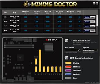 MINING DOCTOR – Exklusive Anwendung von BIOSTAR, um den aktuellen Status jeder GPU wie Nutzung, Kerne, Taktfrequenz, Speichertakt, Lüftergeschwindigkeit und Temperatur zu überprüfen. Wenn iMiner einen Fehlerstatus aufweist, wird darüber hinaus sofort eine E-Mail-Benachrichtigung gesendet, um eine einfache Überwachung und Verwaltung der skalierten Krypto-Mining-Farm zu ermöglichen.