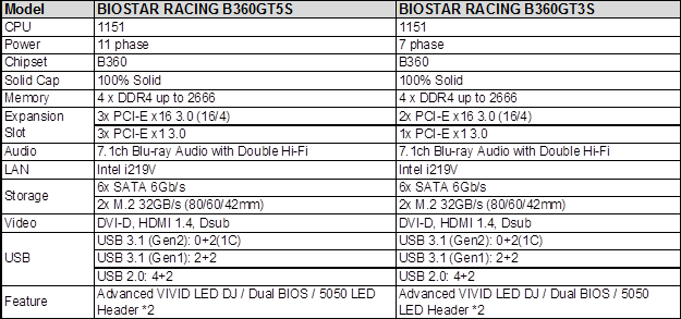 Taipei, Taiwan, 3. April 2018 – Nach dem Erfolg der preisgekrönten Motherboards der BIOSTAR RACING Z370-Serie für Enthusiasten kündigt BIOSTAR seine Mainstream-Gaming-Mainboards mit dem Intel B360-Chipsatz für preisbewusste Gamer an, die die neuesten Features der Intel 300-Serie und der Coffee Lake-Plattform zum attraktiven Preis verlangen. Dazu gehören das ATX-Motherboard BIOSTAR RACING B360GT5S und das Micro-ATX-Motherboard BIOSTAR RACING B360GT3S. Diese sind mit dem neuen RACING-Design und schwarzem PCB speziell für PC-Spieler gedacht. Beide Modelle verfügen über integriertes USB 3.1 Gen.2 (Typ-C), die neuesten A.I. FAN Tools zur automatischen Erkennung von Temperaturen und Lüftersteuerung sowie über Advanced VIVID LED DJ für eine erweiterte RGB-Steuerung.