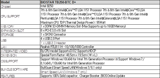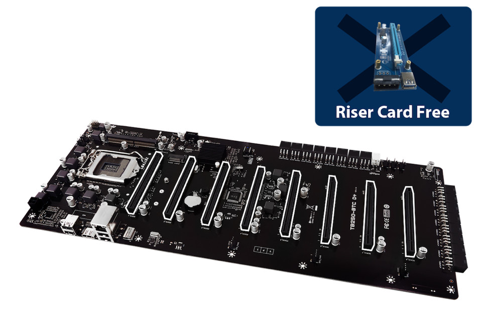 Durch den Verzicht auf Riser-Karten können die Setup-Kosten reduziert werden (eine Einsparung von 7 bis 10 US-Dollar pro Riser-Karte) und senkt auch die Betriebskosten durch zuverlässigere Hardware sowie reduzierten Stromverbrauch und damit niedrigere Stromrechnung. Der Intel B250 Chipsatz ermöglicht die Ausstattung des BIOSTAR TB250-BTC D+ mit acht nativen PCI Express x16 Steckplätzen und erreicht dadurch ein optimales Preis-Leistungsverhältnis bezüglich Grafikkarten pro Motherboard. Abgesehen von den Kosteneinsparungen ist das TB250-BTC D+ zuverlässiger und stabiler ohne das Risiko von Burnout- und Kapazitätsproblemen.