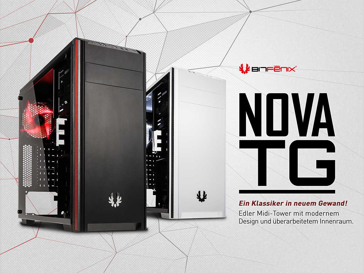 Der BitFenix Nova war ein sehr beliebter Midi-Tower, dessen schlichtes Design viele Freunde und Abnehmer fand. Mit dem Nova TG präsentierte BitFenix nun die modernisierte Version mit 4 Millimeter starkem Seitenfenster aus getöntem Hartglas, womit der aktuelle Trend vieler Gehäuse-Hersteller verfolgt werden soll. Das Ergebnis kann sich dabei durchaus sehen lassen, denn das Hartglas integriert sich perfekt in das übrige Design des Towers. Dieser ist dabei wahlweise in Schwarz oder Weiß erhältlich und beweist mit roten bzw. schwarzen Mesh-Streifen an der Front, dass geschickt platzierte Akzente durchaus wirkungsvoll sein können und einen positiven Einfluss auf das Gesamtbild erzeugen.