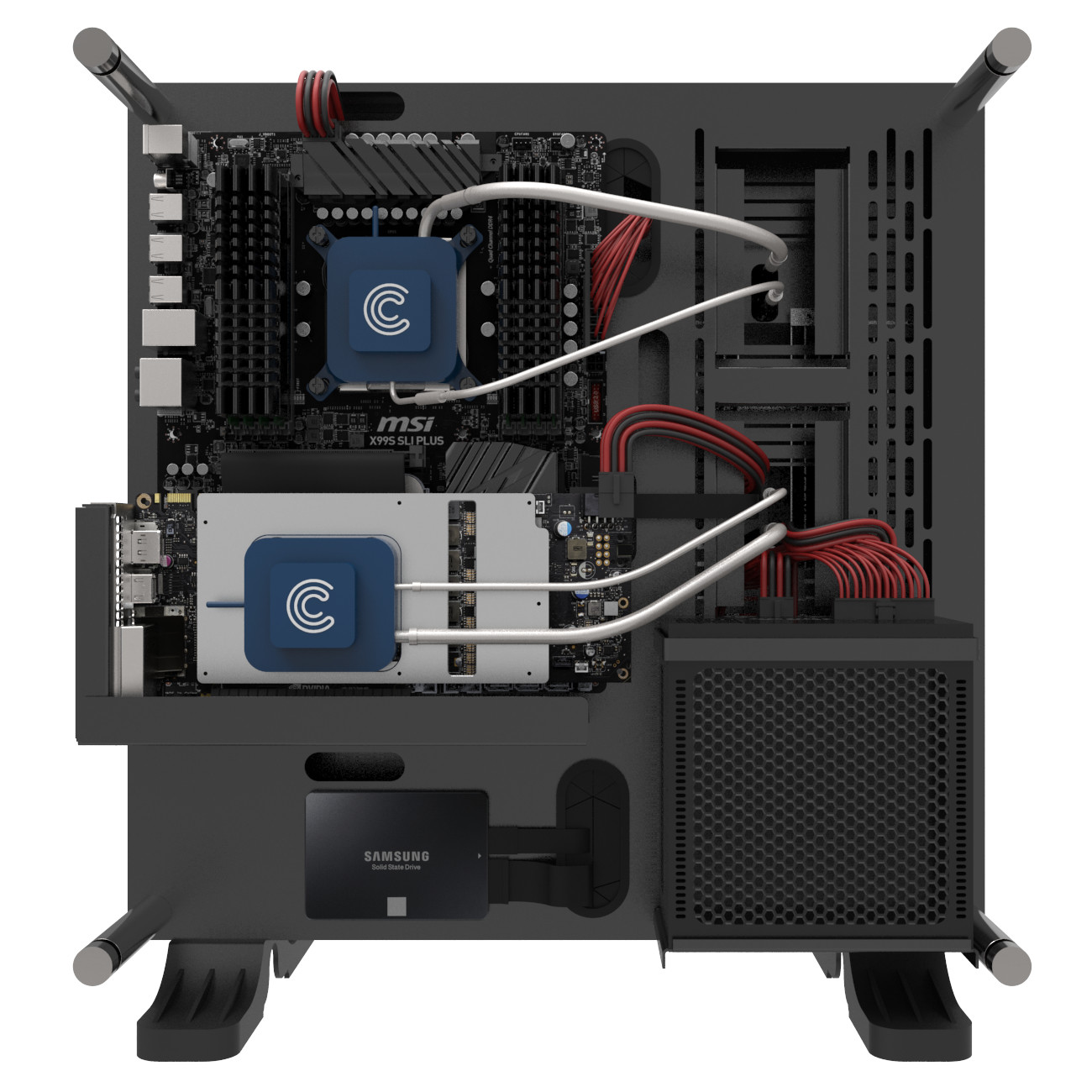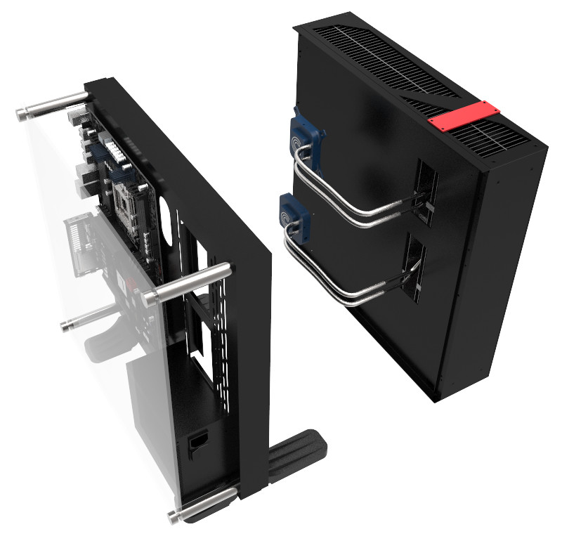 Der Kühlungsexperte Calyos hat ein Passiv-Kühlungskit für das Thermaltake Core P3 Chassis enthüllt. Das Kit wird auf der Rückseite des Core P3 befestigt, von dort führen dann zwei Heatsinks mit mehreren Heatpipes in den vorderen Bereich, wo GPU und CPU gekühlt werden müssen. Supported werden im CPU Bereich alle modernen Sockel von Intel und AMD. Der Hersteller spricht von einer maximal zu kühlenden TDP von 100W (CPU) und 180W (GPU). In Hardware ausgedrückt bedeutet dies, dass man einen Intel Core i7 6700K mit einer GTX 1080 GPU passiv kühlen kann.
