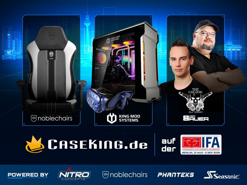 Berlin, 27.08.18 Vom 31. August bis zum 5. September 2018 findet man Caseking gleich zweimal auf der IFA. In Halle 2.2 Stand 112 sind einzigartige und extrem schnelle Gaming-PCs zu bewundern. Hier können aktuelle Spiele auf bequemen Gaming-Stühlen von noblechairs und Nitro Concepts getestet werden. Zudem kann man sich Eindrücke virtueller Welten in Casekings VR-Käfig verschaffen.