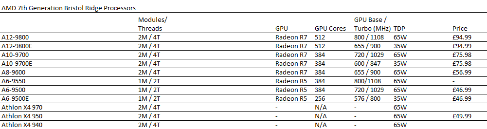 Die folgenden Preise sind in Pfund und werden bei uns in Euro 10% höher ausfallen. Das entspräche dann einem Preis für den A12-9800 von ca. 105€.