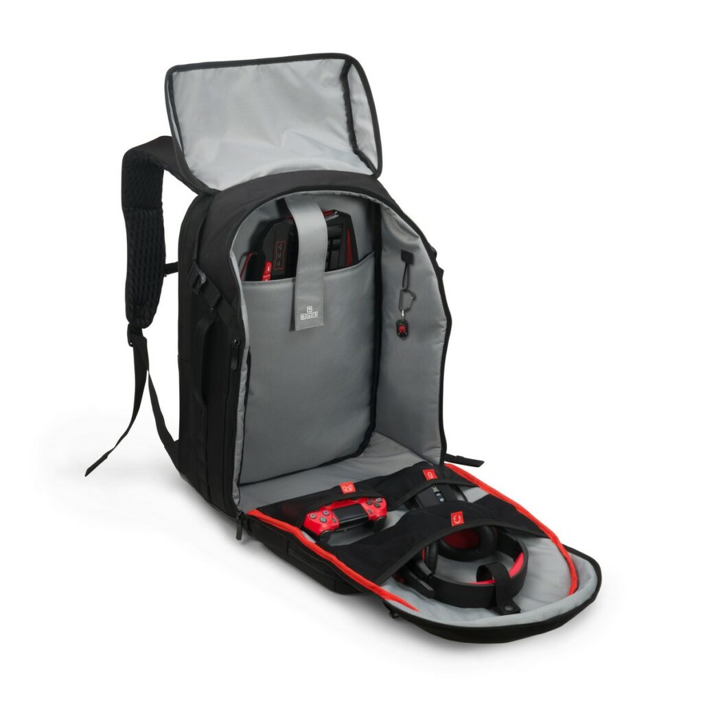 Das praktische Gaming-Backpack CUMBATTANT bietet mit 38 Litern Stauraum ausreichend Platz, um das komplette Gaming-Equipment sicher unterzubringen. In dem großen und geräumigen Hauptfach können sowohl die Konsole als auch das gesamte Gaming-Zubehör ohne Weiteres aufbewahrt werden. Mithilfe der praktischen, eingenähten Icons ist direkt zu erkennen, in welchen Fächern sich die einzelnen Komponenten unterbringen lassen. Das Frontpanel lässt sich komplett öffnen und die Produkte sind sofort griffbereit. Zudem befindet sich auf der Rückseite des Rucksacks ein großes und gut gepolstertes Fach für die sorgenfreie Aufbewahrung des Notebooks. Um weitere Gegenstände wie bspw. eine Trinkflasche, den Geldbeutel oder Kabel zu transportieren, gibt es an den Seiten sowie an der Vorder- und Oberseite des Backpacks weitere Fächer. Außerdem lässt sich ein nützlicher Schlüsselanhänger per Clip in der vorderen Tasche integrieren. Das verhindert die lange und lästige Suche nach dem Schlüssel in den Tiefen des Rucksacks.