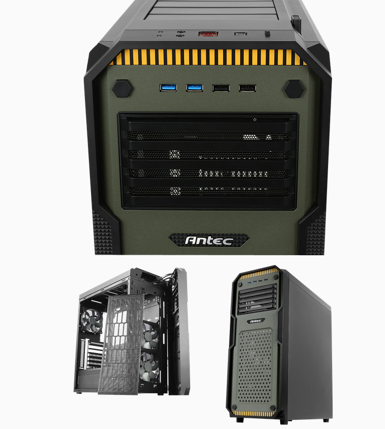 Antecs jüngster Gaming-Zuwachs ist das GX909: Im militärischen Stil mit einer grünen Frontplatte und einem Grid-Design, kommt das robuste Gehäuse (aus 0,6 mm kaltgewalztem Stahl) mit zwei eingebauten 120 mm grünen Ansauglüftern vorne sowie einem grünen 120 mm Abluftventilator hinten daher. Die attraktiven Luftflügel auf der Oberseite ermöglichen eine bessere Belüftung, denn sie lassen sich um 10 bzw. 20 Grad öffnen. Intern bietet das Chassis viel Platz für Grafikkarten mit bis zu 400 mm Länge, sieben Erweiterungssteckplätze, zwei 3,5 „Festplattenhalterungen und zwei 2,5“ SSD-Halterungen. Das GX909 unterstützt einen 240 mm Kühler auf der Oberseite, einen 360 mm Kühler vorne und einen optionalen 120 mm Kühler hinten. Darüber hinaus verfügt es über ein Kammerdesign, das die Stromversorgung von den anderen Komponenten trennt, um Wärmeentwicklung zu minimieren und Systemgeräusche zu reduzieren. Das Frontpanel bietet Audio-Buchsen, Lüfter-Steuerschalter, 2x USB 3.0, 2x USB 2.0 und Power / Reset-Taste.