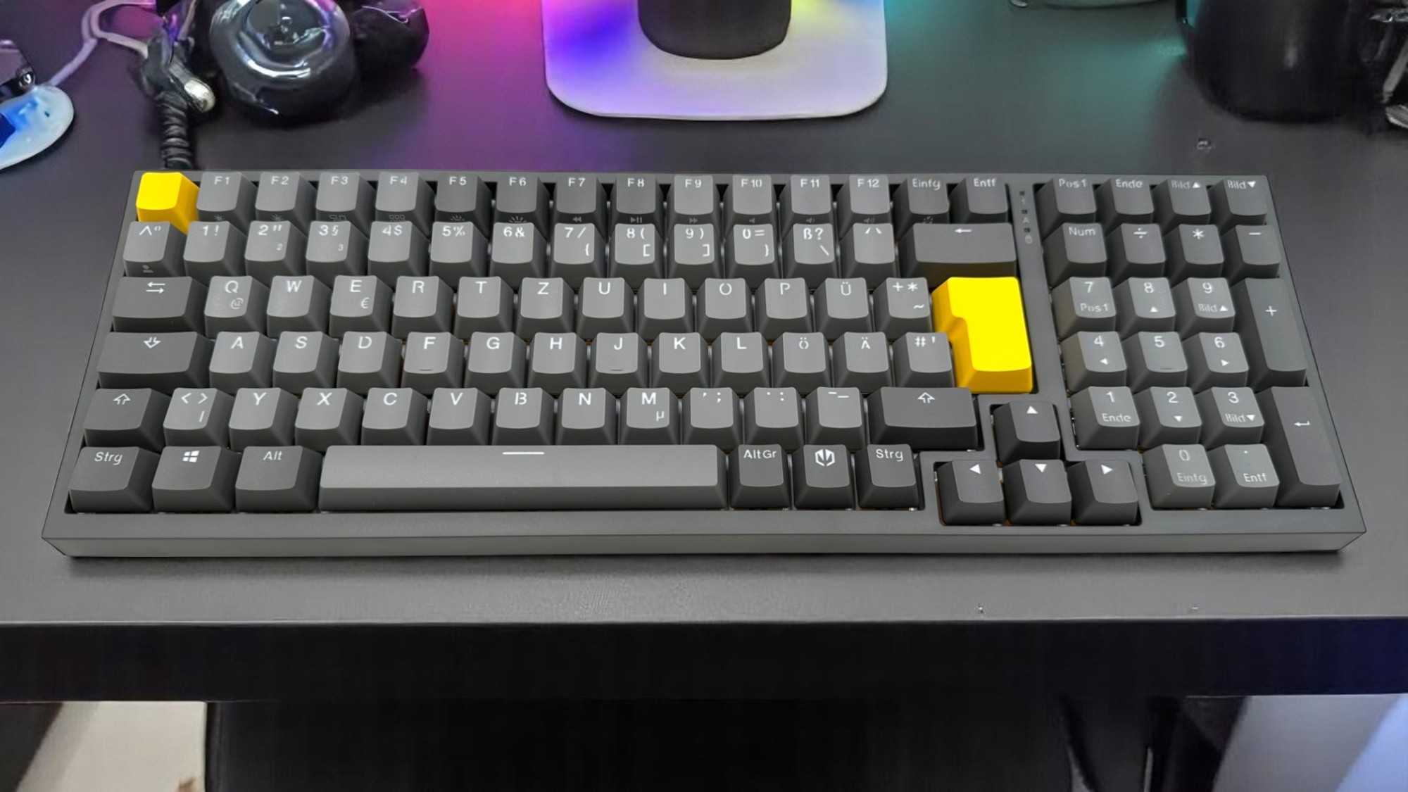 Die ENDORFY Celeris 1800 kommt in einem eleganten und modernen Altgrau mit gelben Farbakzenten auf ESC- und Enter-Tasten. Unter den Tastenkappen aus hochwertigen und robusten PBT-Kunststoff werkeln die hauseigenen und vorgeschmierten ENDORFY Yellow Schalter. Hierbei handelt es sich um mechanischen Schalter, welche sich linear betätigen lassen und in Zusammenarbeit mit Gateron, einem namhaften Hersteller von Tastaturschaltern, entstanden sind. Dazu unterstützt die Tastatur nicht nur Microsofts Windows, sondern auch Apples macOS – durch einen Schalter an der Seite kann man die Steuerung dem jeweiligen Betriebssystem anpassen. Zudem liegen für macOS entsprechende Tastenkappen zum Austausch bei.